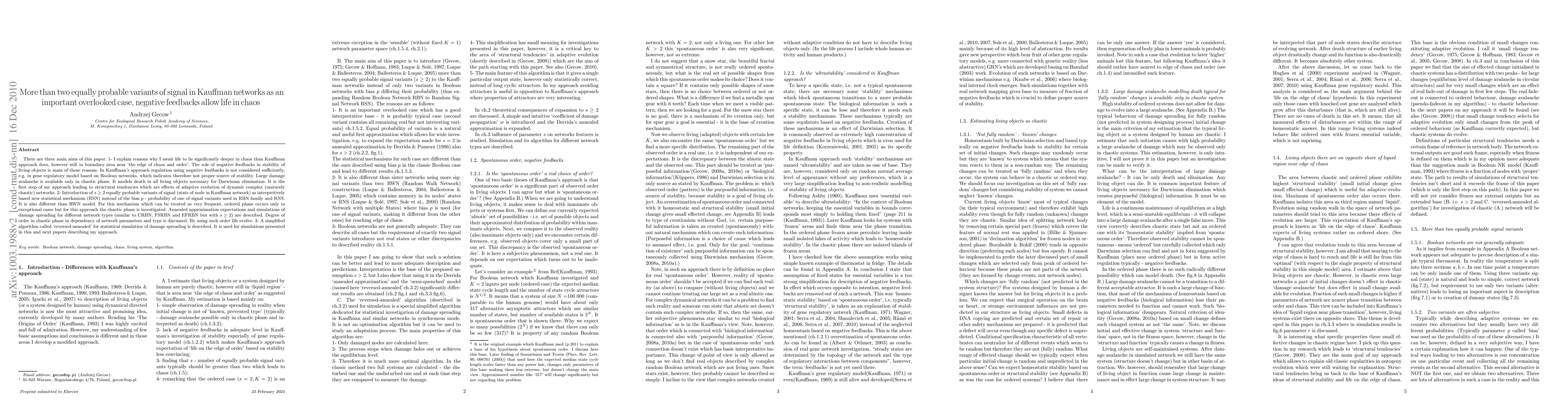 There are three main aims of this paper. 1- I explain reasons why I await life to lie significantly deeper in chaos than Kauffman approach does, however still in boundary area near `the edge of chaos and order'. The role of negative feedbacks in stability of living objects is main of those reasons. In Kauffman's approach regulation using negative feedbacks is not considered sufficiently, e.g. in gene regulatory model based on Boolean networks, which indicates therefore not proper source of stability. Large damage avalanche is available only in chaotic phase. It models death in all living objects necessary for Darwinian elimination. It is the first step of my approach leading to structural tendencies which are effects of adaptive evolution of dynamic complex (maturely chaotic) networks. 2- Introduction of s>=2 equally probable variants of signal (state of node in Kauffman network) as interpretively based new statistical mechanism (RSN) instead of the bias p - probability of one of signal variants used in RBN family and RNS. It is also different than RWN model. For this mechanism which can be treated as very frequent, ordered phase occurs only in exceptional cases but for this approach the chaotic phase is investigated. Annealed approximation expectations and simulations of damage spreading for different network types (similar to CRBN, FSRBN and EFRBN but with s>=2) are described. Degree of order in chaotic phase in dependency of network parameters and type is discussed. By using such order life evolve. 3- A simplified algorithm called `reversed-annealed' for statistical simulation of damage spreading is described. It is used for simulations presented in this and next papers describing my approach.