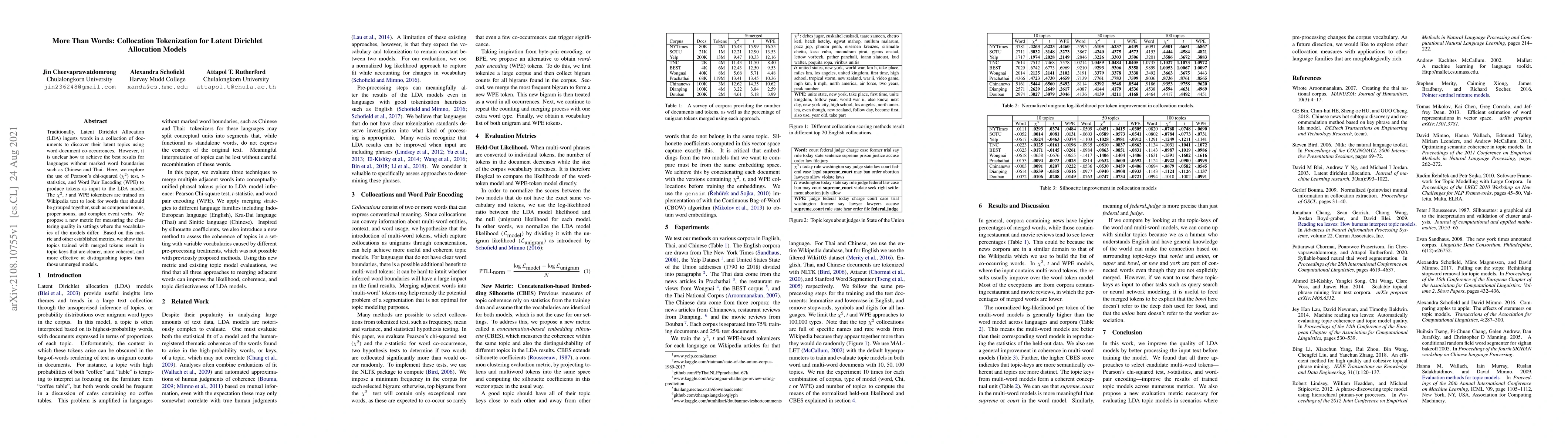 Traditionally, Latent Dirichlet Allocation (LDA) ingests words in a collection of documents to discover their latent topics using word-document co-occurrences. However, it is unclear how to achieve the best results for languages without marked word boundaries such as Chinese and Thai. Here, we explore the use of Pearson's chi-squared test, t-statistics, and Word Pair Encoding (WPE) to produce tokens as input to the LDA model. The Chi-squared, t, and WPE tokenizers are trained on Wikipedia text to look for words that should be grouped together, such as compound nouns, proper nouns, and complex event verbs. We propose a new metric for measuring the clustering quality in settings where the vocabularies of the models differ. Based on this metric and other established metrics, we show that topics trained with merged tokens result in topic keys that are clearer, more coherent, and more effective at distinguishing topics than those unmerged models.