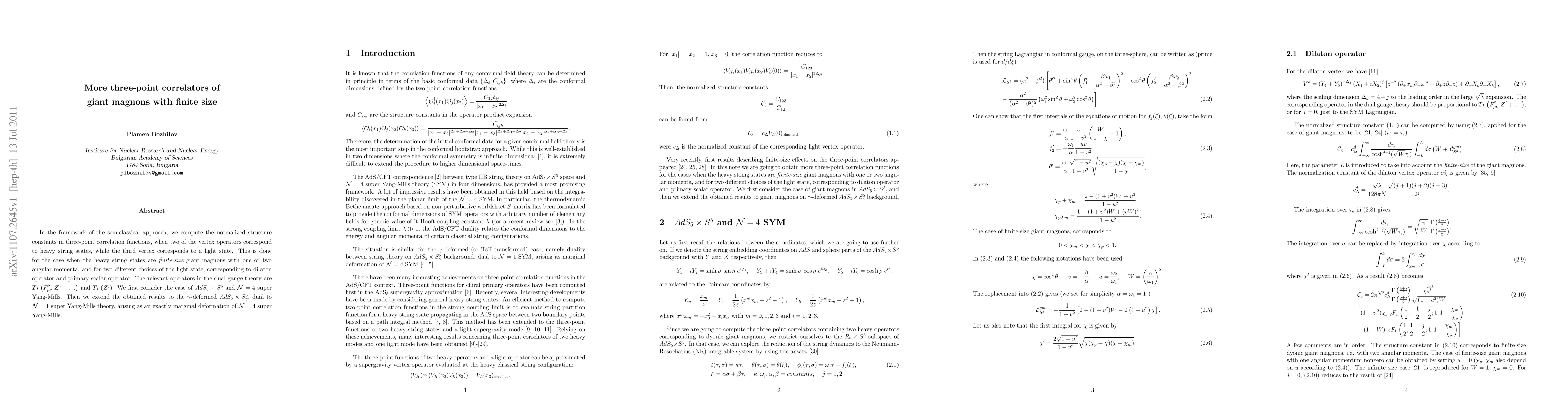 In the framework of the semiclassical approach, we compute the normalized structure constants in three-point correlation functions, when two of the vertex operators correspond to heavy string states, while the third vertex corresponds to a light state. This is done for the case when the heavy string states are finite-size giant magnons with one or two angular momenta, and for two different choices of the light state, corresponding to dilaton operator and primary scalar operator. The relevant operators in the dual gauge theory are Tr(F_{\mu\nu}^2 Z^j+...) and Tr(Z^j). We first consider the case of AdS_5 x S^5 and N = 4 super Yang-Mills. Then we extend the obtained results to the gamma-deformed AdS_5 x S^5_\gamma, dual to N = 1 super Yang-Mills theory, arising as an exactly marginal deformation of N = 4 super Yang-Mills.