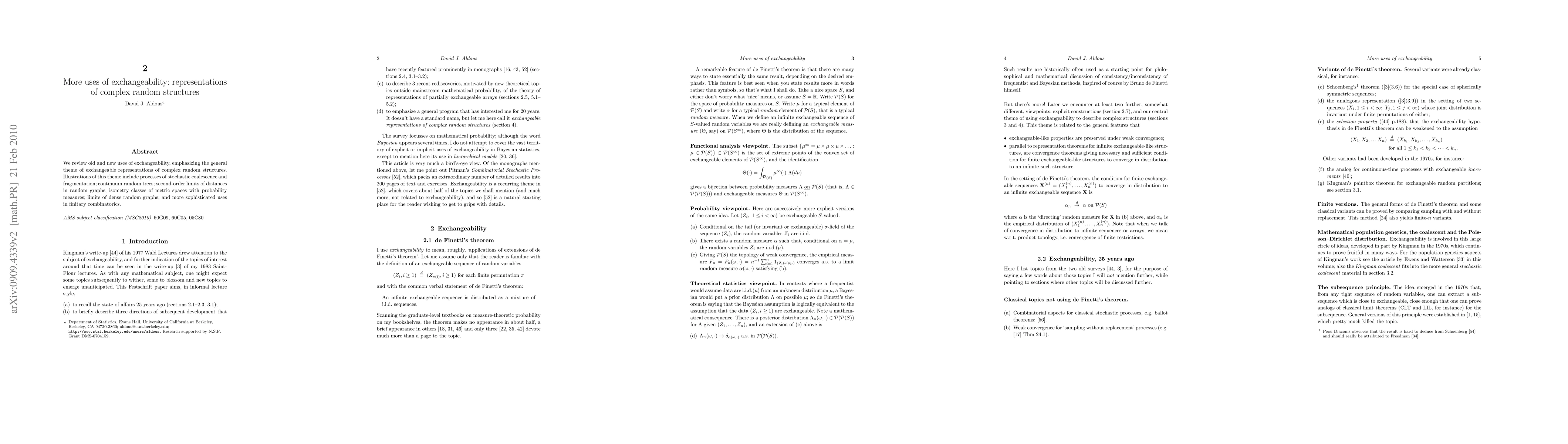 We review old and new uses of exchangeability, emphasizing the general theme of exchangeable representations of complex random structures. Illustrations of this theme include processes of stochastic coalescence and fragmentation; continuum random trees; second-order limits of distances in random graphs; isometry classes of metric spaces with probability measures; limits of dense random graphs; and more sophisticated uses in finitary combinatorics.