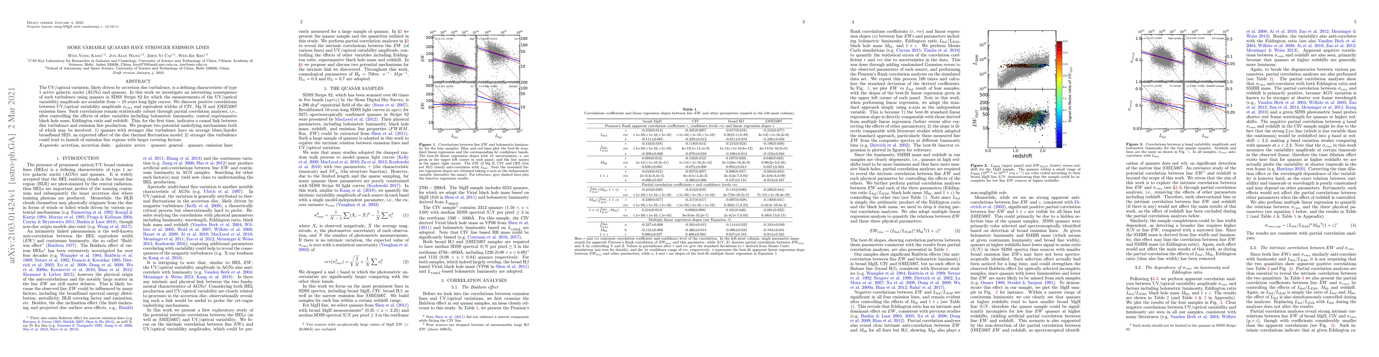 The UV/optical variation, likely driven by accretion disc turbulence, is a defining characteristic of type 1 active galactic nuclei (AGNs) and quasars. In this work we investigate an interesting consequence of such turbulence using quasars in SDSS Stripe 82 for which the measurements of the UV/optical variability amplitude are available from $\sim$ 10 years long light curves. We discover positive correlations between UV/optical variability amplitude $\sigma_{rms}$ and equivalent widths of CIV, Mg II and [OIII]5007 emission lines. Such correlations remain statistically robust through partial correlation analyses, i.e., after controlling the effects of other variables including bolometric luminosity, central supermassive black hole mass, Eddington ratio and redshift. This, for the first time, indicates a causal link between disc turbulence and emission line production. We propose two potential underlying mechanisms both of which may be involved: 1) quasars with stronger disc turbulence have on average bluer/harder broadband SED, an expected effect of the disc thermal fluctuation model; 2) stronger disc turbulence could lead to launch of emission line regions with larger covering factors.