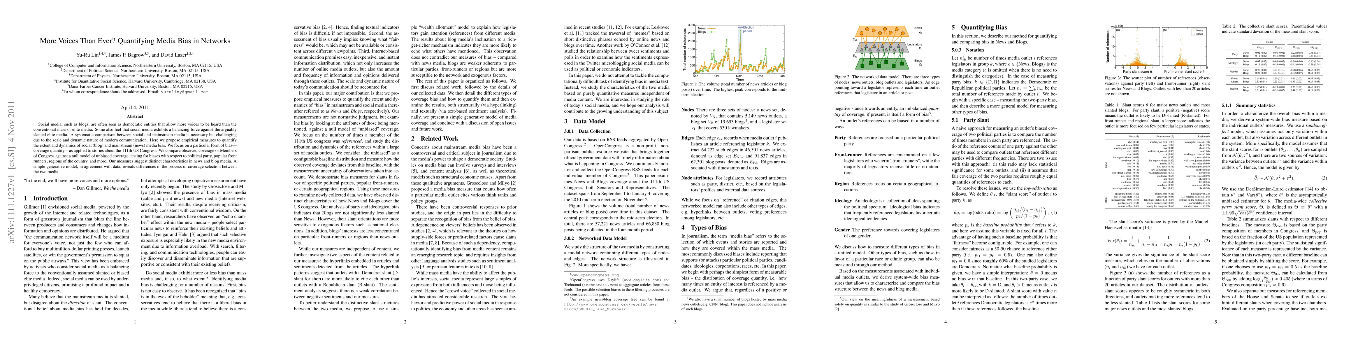 Social media, such as blogs, are often seen as democratic entities that allow more voices to be heard than the conventional mass or elite media. Some also feel that social media exhibits a balancing force against the arguably slanted elite media. A systematic comparison between social and mainstream media is necessary but challenging due to the scale and dynamic nature of modern communication. Here we propose empirical measures to quantify the extent and dynamics of social (blog) and mainstream (news) media bias. We focus on a particular form of bias---coverage quantity---as applied to stories about the 111th US Congress. We compare observed coverage of Members of Congress against a null model of unbiased coverage, testing for biases with respect to political party, popular front runners, regions of the country, and more. Our measures suggest distinct characteristics in news and blog media. A simple generative model, in agreement with data, reveals differences in the process of coverage selection between the two media.