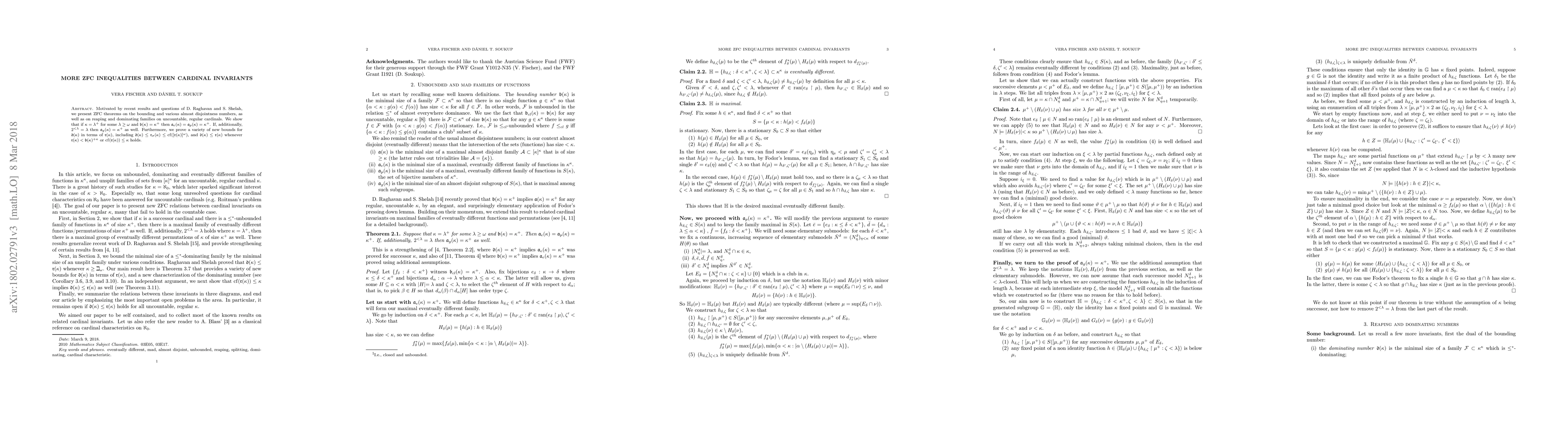 Motivated by recent results and questions of D. Raghavan and S. Shelah, we present ZFC theorems on the bounding and various almost disjointness numbers, as well as on reaping and dominating families on uncountable, regular cardinals. We show that if $\kappa=\lambda^+$ for some $\lambda\geq \omega$ and $\mathfrak b(\kappa)=\kappa^+$ then $\mathfrak a_e(\kappa)=\mathfrak a_p(\kappa)=\kappa^+$. If, additionally, $2^{<\lambda}=\lambda$ then $\mathfrak a_g(\kappa)=\kappa^+$ as well. Furthermore, we prove a variety of new bounds for $\mathfrak d(\kappa)$ in terms of $\mathfrak r(\kappa)$, including $\mathfrak d(\kappa)\leq \mathfrak r_\sigma(\kappa)\leq \mathrm{cof}([\mathfrak r(\kappa)]^\omega)$, and $\mathfrak d(\kappa)\leq \mathfrak r(\kappa)$ whenever $\mathfrak r(\kappa)<\mathfrak b(\kappa)^{+\kappa}$ or $\mathrm{cof}(\mathfrak r(\kappa))\leq \kappa$ holds.