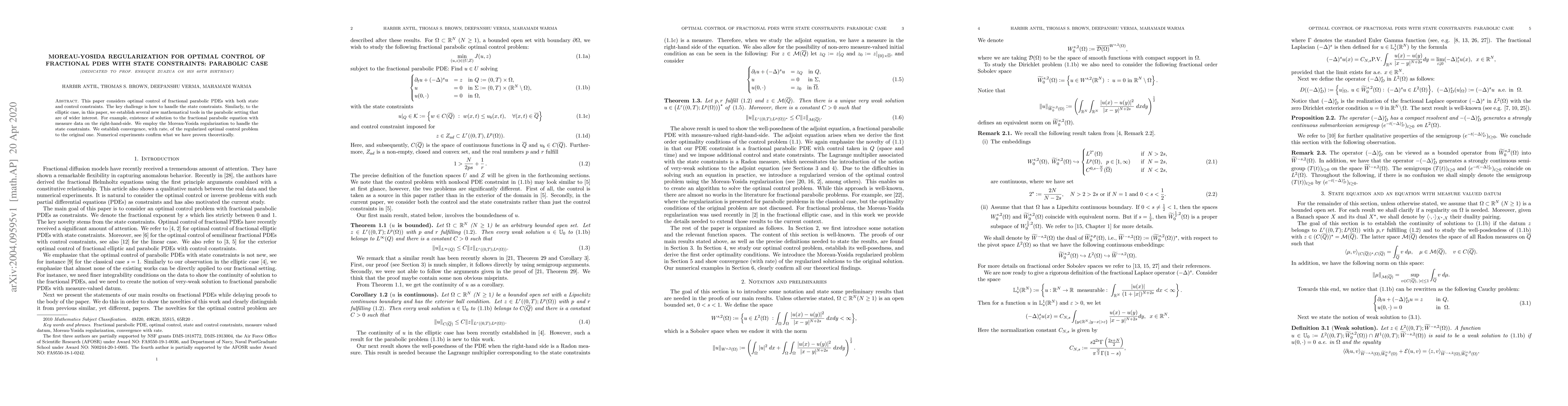 This paper develops new mathematical tools for optimal control of fractional parabolic PDEs with state and control constraints, utilizing Moreau-Yosida regularization to manage state constraints. It proves convergence of the regularized problem to the original, with numerical experiments validating theoretical results.