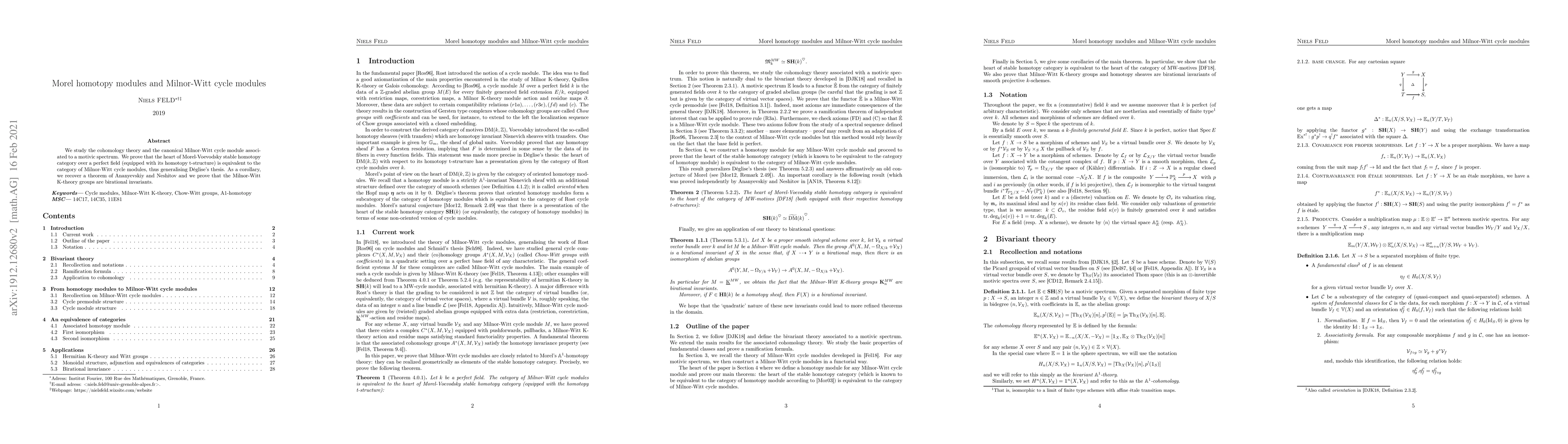 This paper proves the equivalence between the heart of the Morel-Voevodsky stable homotopy category over a perfect field and the category of Milnor-Witt cycle modules, generalizing D\'eglise's work. It also establishes that the Milnor-Witt K-theory groups are birational invariants.