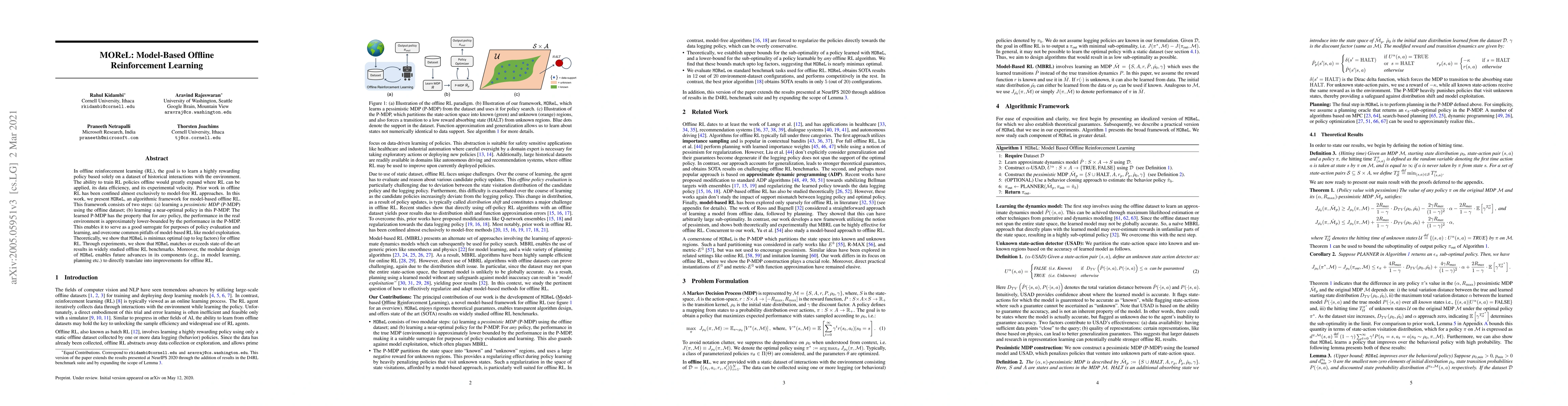In offline reinforcement learning (RL), the goal is to learn a highly rewarding policy based solely on a dataset of historical interactions with the environment. The ability to train RL policies offline can greatly expand the applicability of RL, its data efficiency, and its experimental velocity. Prior work in offline RL has been confined almost exclusively to model-free RL approaches. In this work, we present MOReL, an algorithmic framework for model-based offline RL. This framework consists of two steps: (a) learning a pessimistic MDP (P-MDP) using the offline dataset; and (b) learning a near-optimal policy in this P-MDP. The learned P-MDP has the property that for any policy, the performance in the real environment is approximately lower-bounded by the performance in the P-MDP. This enables it to serve as a good surrogate for purposes of policy evaluation and learning, and overcome common pitfalls of model-based RL like model exploitation. Theoretically, we show that MOReL is minimax optimal (up to log factors) for offline RL. Through experiments, we show that MOReL matches or exceeds state-of-the-art results in widely studied offline RL benchmarks. Moreover, the modular design of MOReL enables future advances in its components (e.g. generative modeling, uncertainty estimation, planning etc.) to directly translate into advances for offline RL.