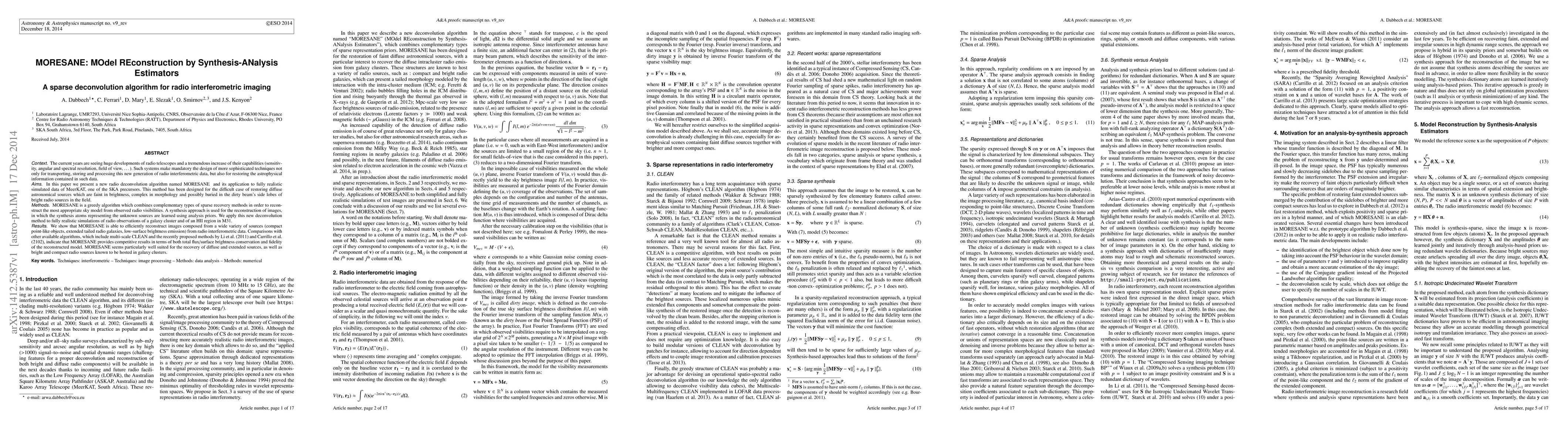 (arXiv abridged abstract) The current years are seeing huge developments of radio telescopes and a tremendous increase of their capabilities. Such systems make mandatory the design of more sophisticated techniques not only for transporting, storing and processing this new generation of radio interferometric data, but also for restoring the astrophysical information contained in such data. In this paper we present a new radio deconvolution algorithm named MORESANE and its application to fully realistic simulated data of MeerKAT, one of the SKA precursors. This method has been designed for the difficult case of restoring diffuse astronomical sources which are faint in brightness, complex in morphology and possibly buried in the dirty beam's side lobes of bright radio sources in the field. MORESANE is a greedy algorithm which combines complementary types of sparse recovery methods in order to reconstruct the most appropriate sky model from observed radio visibilities. A synthesis approach is used for the reconstruction of images, in which the synthesis atoms representing the unknown sources are learned using analysis priors. We apply this new deconvolution method to fully realistic simulations of radio observations of a galaxy cluster and of an HII region in M31. We show that MORESANE is able to efficiently reconstruct images composed from a wide variety of sources from radio interferometric data. Comparisons with other available algorithms, which include multi-scale CLEAN and the recently proposed methods by Li et al. (2011) and Carrillo et al. (2012), indicate that MORESANE provides competitive results in terms of both total flux/surface brightness conservation and fidelity of the reconstructed model. MORESANE seems particularly well suited for the recovery of diffuse and extended sources, as well as bright and compact radio sources known to be hosted in galaxy clusters.