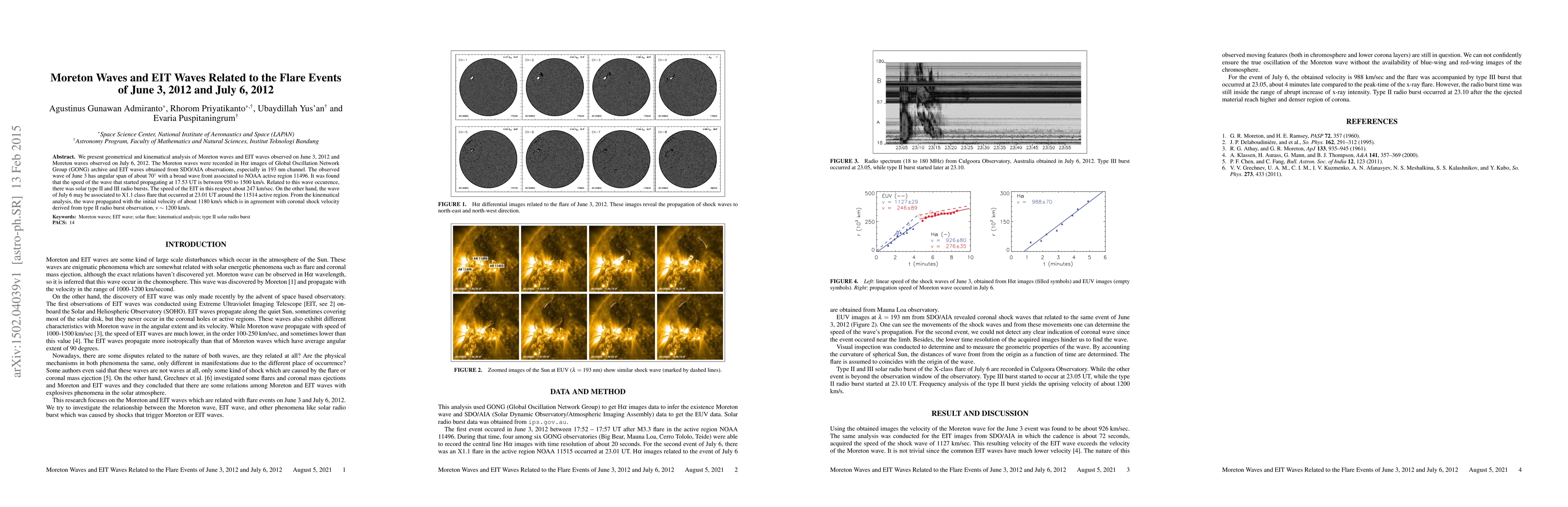 This paper analyzes Moreton waves and EIT waves linked to solar flare events on June 3, 2012, and July 6, 2012. The June 3 wave had an angular span of $70^{\circ}$ and a speed of 950-1500 km/s, associated with solar radio bursts, while the EIT wave speed was 247 km/s. The July 6 wave, linked to an X1.1 flare, had an initial velocity of 1180 km/s, consistent with coronal shock velocities from radio burst observations.