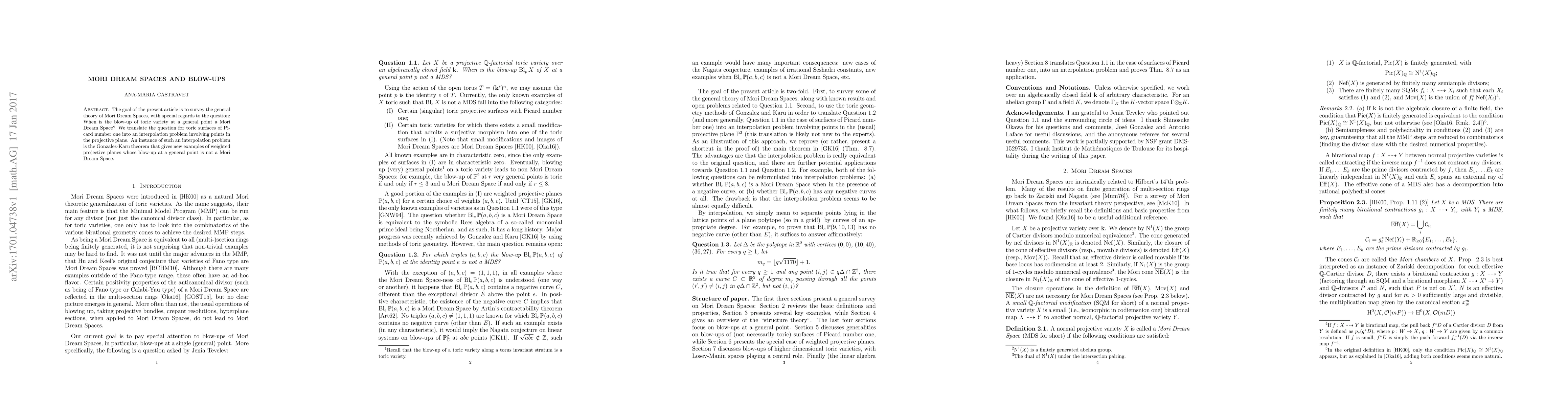 This paper surveys Mori Dream Spaces and investigates when blow-ups of toric varieties at general points maintain this property. It translates the question for toric surfaces into an interpolation problem in projective planes, citing the Gonzalez-Karu theorem as an example where the blow-up fails to be a Mori Dream Space.