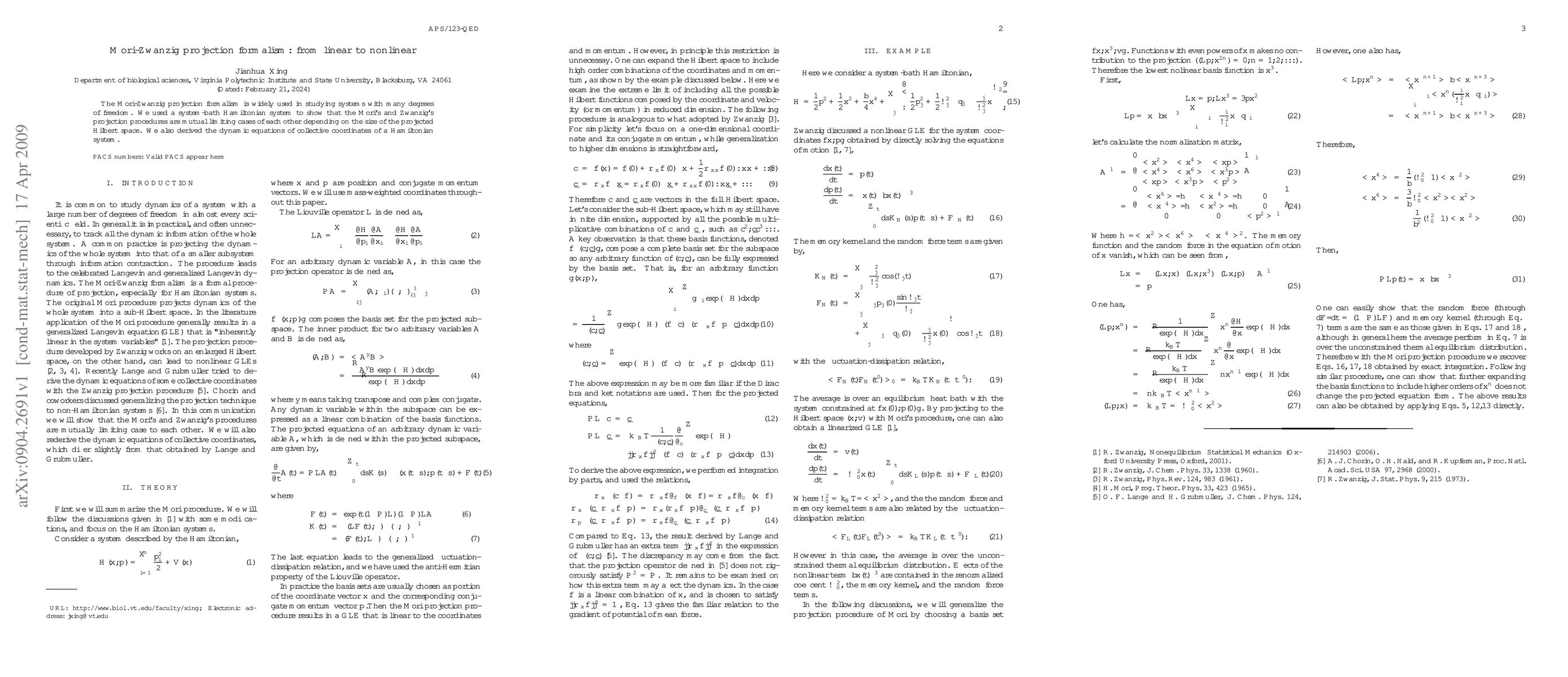 The Mori-Zwanzig projection formalism is explored to demonstrate the relationship between linear and nonlinear dynamics in systems with many degrees of freedom. The study reveals that Mori's and Zwanzig's projection methods are limiting cases of each other based on the size of the projected Hilbert space, and it derives dynamic equations for collective coordinates in Hamiltonian systems.