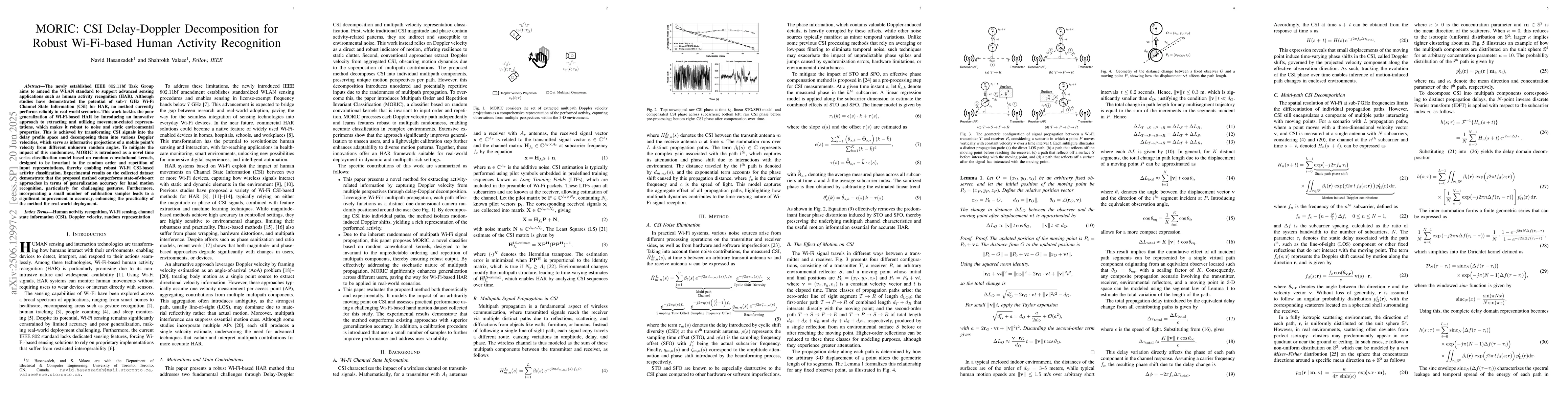The newly established IEEE 802.11bf Task Group aims to amend the WLAN standard to support advanced sensing applications such as human activity recognition (HAR). Although studies have demonstrated the potential of sub-7 GHz Wi-Fi Channel State Information (CSI) for HAR, no method currently performs reliably in real-world scenarios. This work tackles the poor generalization of Wi-Fi-based HAR by introducing an innovative approach to extracting and utilizing movement-related representations, which makes it robust to noise and static environmental properties. This is achieved by transforming CSI signals into the delay profile space and decomposing them into various Doppler velocities, which serve as informative projections of a mobile point's velocity from different unknown random angles. To mitigate the impact of this randomness, MORIC is introduced as a novel time series classification model based on random convolutional kernels, designed to be invariant to the random order and repetition of input representations, thereby enabling robust Wi-Fi CSI-based activity classification. Experimental results on the collected dataset demonstrate that the proposed method outperforms state-of-the-art approaches in terms of generalization accuracy for hand motion recognition, particularly for challenging gestures. Furthermore, incorporating a small number of calibration samples leads to a significant improvement in accuracy, enhancing the practicality of the method for real-world deployment.