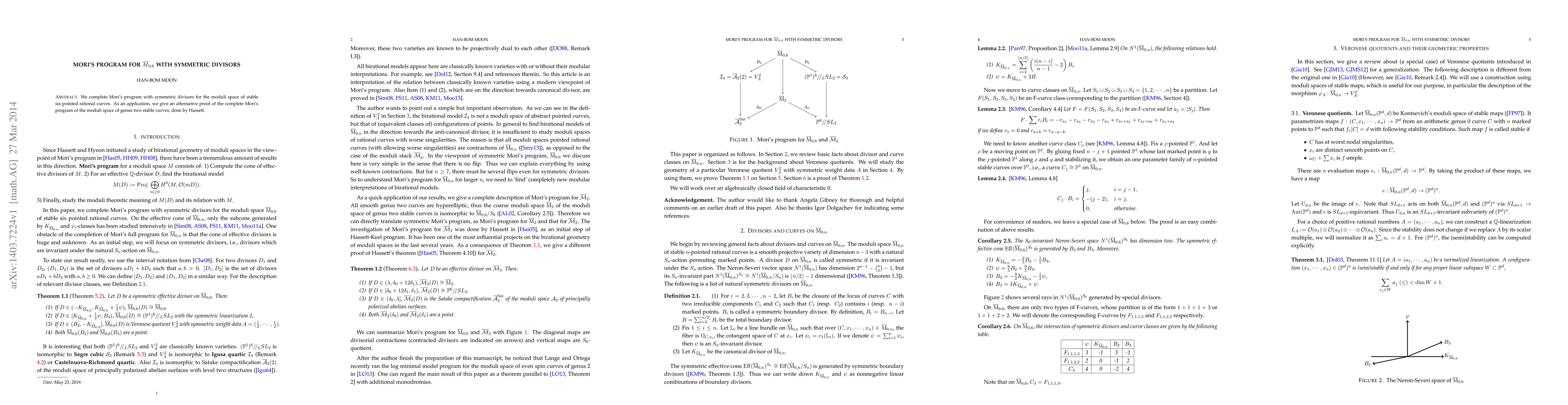 This paper completes Mori's program for the moduli space $\bar{M}_{0,6}$ with symmetric divisors and provides an alternative proof for the complete Mori's program of genus two stable curves as done by Hassett.
