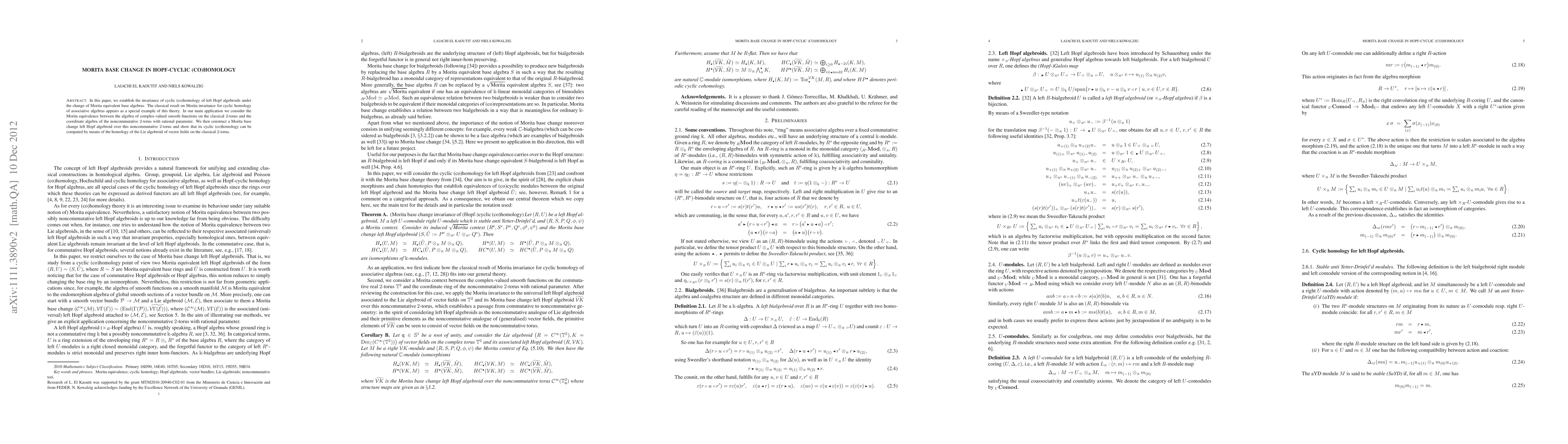 This paper establishes the invariance of cyclic (co)homology for left Hopf algebroids under Morita equivalence, extending classical results for associative algebras. It applies this theory to compute the cyclic (co)homology of a Morita equivalent noncommutative 2-torus via the homology of the Lie algebroid of vector fields on the classical 2-torus.