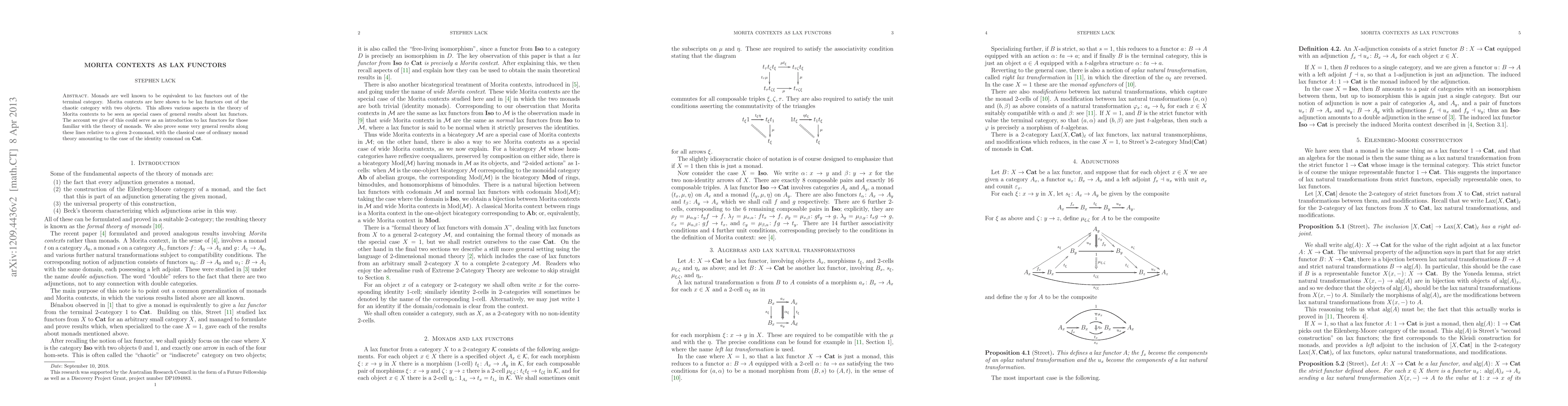 Monads are well known to be equivalent to lax functors out of the terminal category. Morita contexts are here shown to be lax functors out of the chaotic category with two objects. This allows various aspects in the theory of Morita contexts to be seen as special cases of general results about lax functors. The account we give of this could serve as an introduction to lax functors for those familiar with the theory of monads. We also prove some very general results along these lines relative to a given 2-comonad, with the classical case of ordinary monad theory amounting to the case of the identity comonad on Cat.