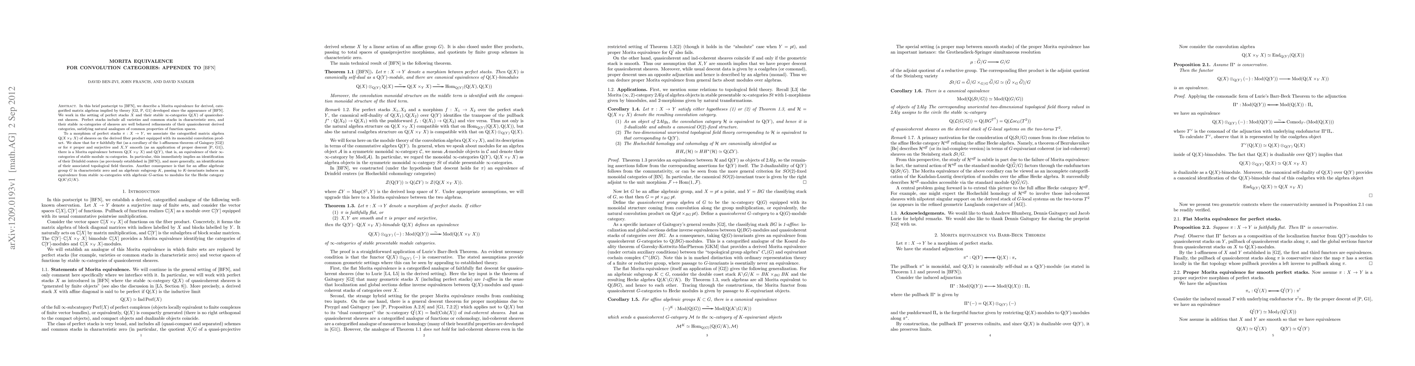 In this brief postscript to our paper "Integral transforms and Drinfeld centers in derived algebraic geometry", we describe a Morita equivalence for derived, categorified matrix algebras implied by theory developed since its appearance. We work in the setting of perfect stacks X and their stable infinity-categories Q(X) of quasicoherent sheaves. Perfect stacks include all varieties and common stacks in characteristic zero, and their stable infinity-categories of sheaves are well behaved refinements of their quasicoherent derived categories, satisfying natural analogues of common properties of function spaces. To a morphism of perfect stacks pi:X-->Y, we associate the categorified matrix algebra Q(X x_Y X) of sheaves on the derived fiber product equipped with its monoidal convolution product. We show that for pi faithfully flat (as a corollary of the 1-affineness theorem of Gaisgory) or for pi proper and surjective and X,Y smooth (as an application of proper descent, cf. Gaitsgory and Preygel), there is a Morita equivalence between Q(X x_Y X) and Q(Y), that is, an equivalence of their infinity-categories of stable module infinity-categories. In particular, this immediately implies an identification of their Drinfeld centers (as previously established in 0805.0157), and more generally, an identification of their associated topological field theories. Another consequence is that for an affine algebraic group G in characteristic zero and an algebraic subgroup K, passing to K-invariants induces an equivalence from stable infinity-categories with algebraic G-action to modules for the Hecke category Q(K\G/K).