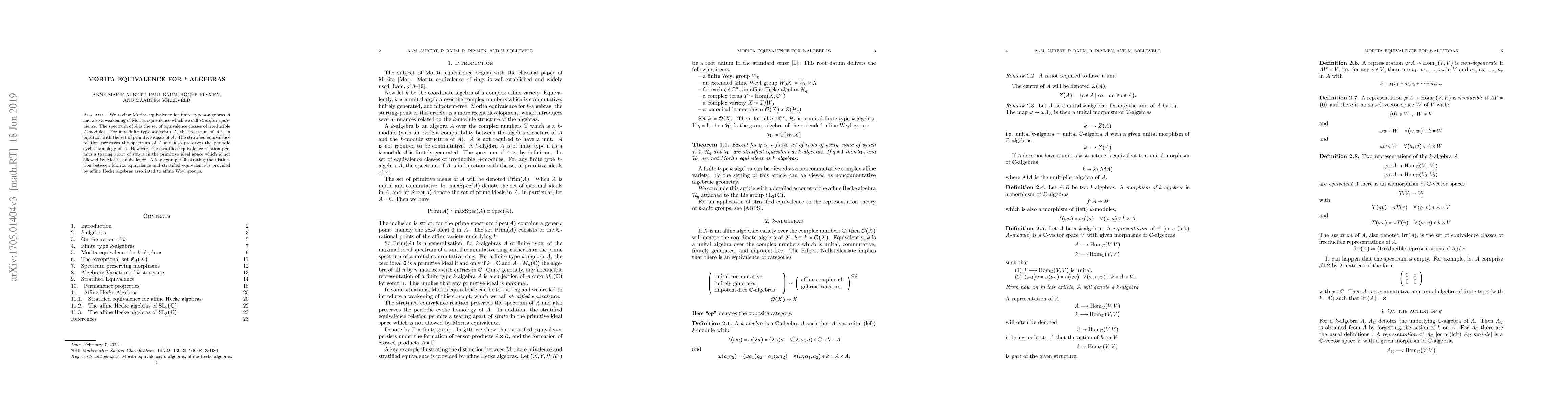 We review Morita equivalence for finite type $k$-algebras $A$ and also a weakening of Morita equivalence which we call stratified equivalence. The spectrum of $A$ is the set of equivalence classes of irreducible $A$-modules. For any finite type $k$-algebra $A$, the spectrum of $A$ is in bijection with the set of primitive ideals of $A$. The stratified equivalence relation preserves the spectrum of $A$ and also preserves the periodic cyclic homology of $A$. However, the stratified equivalence relation permits a tearing apart of strata in the primitive ideal space which is not allowed by Morita equivalence. A key example illustrating the distinction between Morita equivalence and stratified equivalence is provided by affine Hecke algebras associated to extended affine Weyl groups.