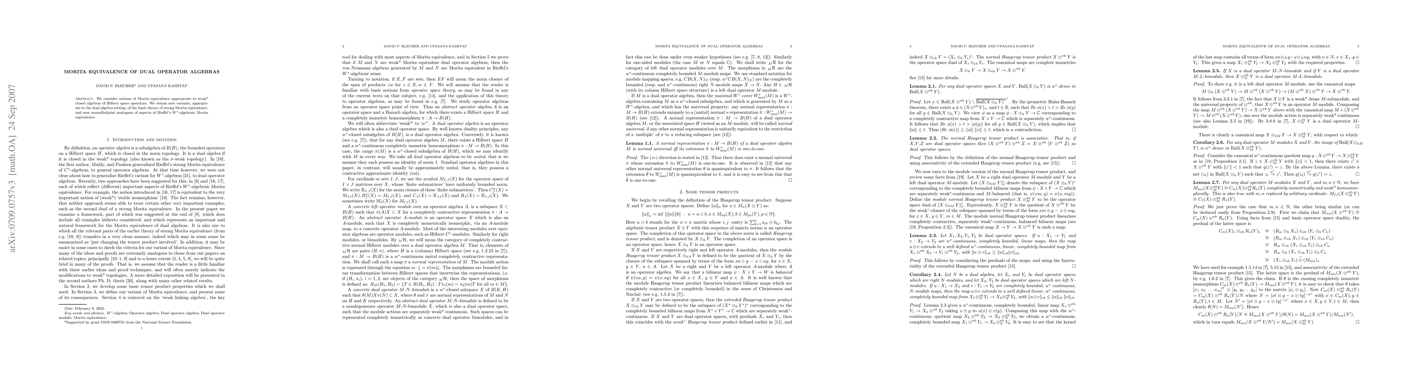 This paper introduces "weak Morita equivalence" for weak* closed algebras of Hilbert space operators and develops a dual algebra variant of strong Morita equivalence, along with nonselfadjoint versions of Rieffel's $W^*$-algebraic Morita equivalence.