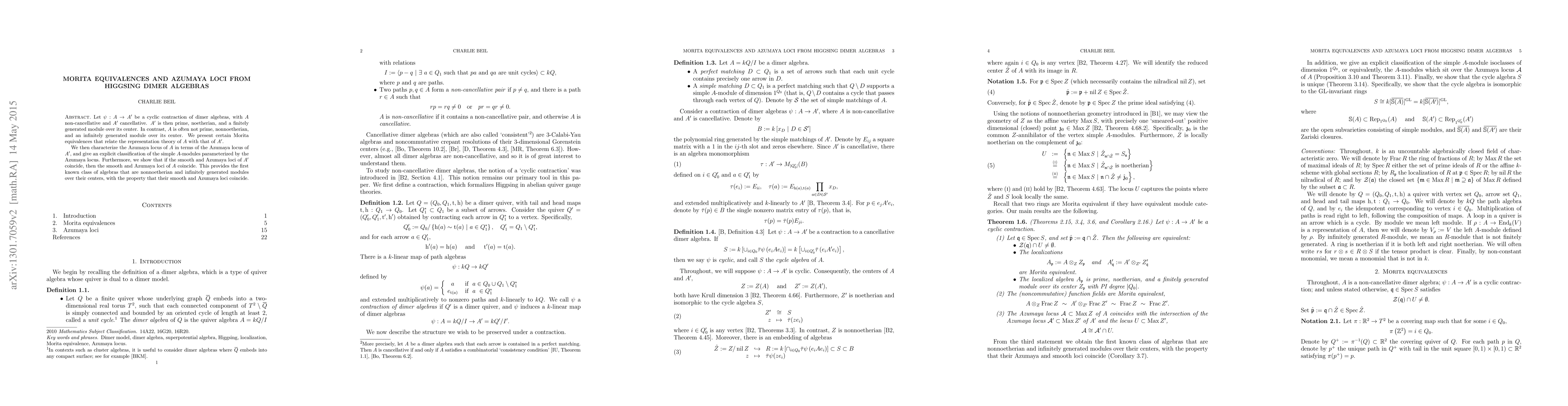 Let $\psi: A \to A'$ be a cyclic contraction of dimer algebras, with $A$ non-cancellative and $A'$ cancellative. $A'$ is then prime, noetherian, and a finitely generated module over its center. In contrast, $A$ is often not prime, nonnoetherian, and an infinitely generated module over its center. We present certain Morita equivalences that relate the representation theory of $A$ with that of $A'$. We then characterize the Azumaya locus of $A$ in terms of the Azumaya locus of $A'$, and give an explicit classification of the simple $A$-modules parameterized by the Azumaya locus. Furthermore, we show that if the smooth and Azumaya loci of $A'$ coincide, then the smooth and Azumaya loci of $A$ coincide. This provides the first known class of algebras that are nonnoetherian and infinitely generated modules over their centers, with the property that their smooth and Azumaya loci coincide.