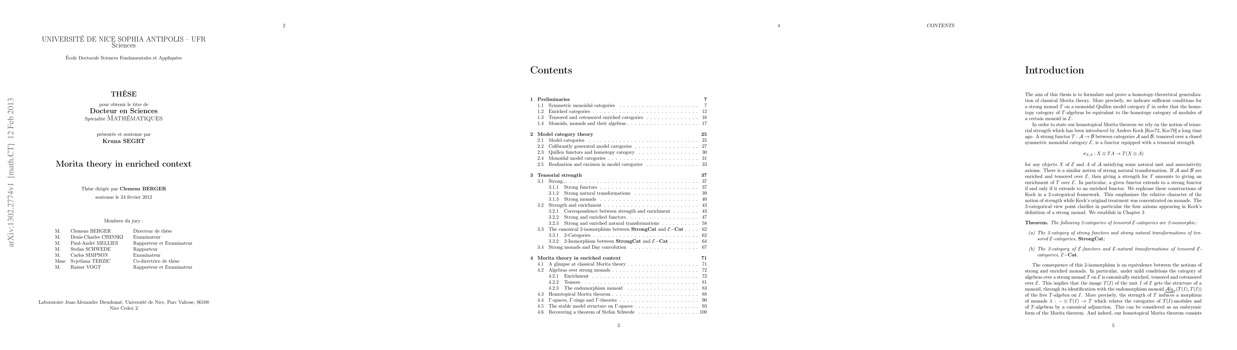 Researchers develop a homotopy theoretical version of Morita theory using strong monads, linking enrichment in monoidal categories to 2-isomorphism, and recover Stefan Schwede's theorem for Gamma-spaces.