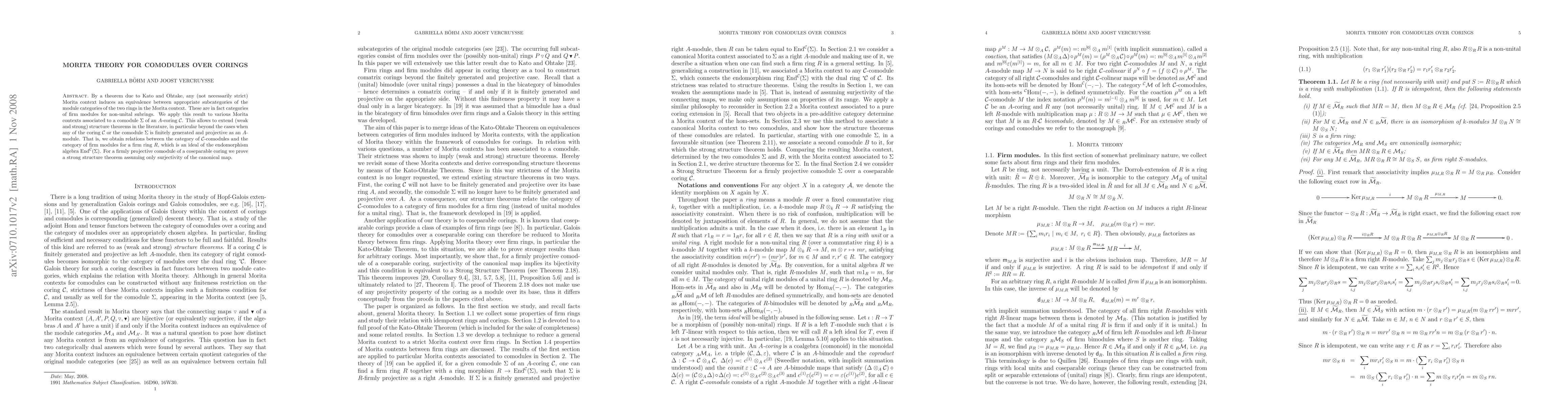 By a theorem due to Kato and Ohtake, any (not necessarily strict) Morita context induces an equivalence between appropriate subcategories of the module categories of the two rings in the Morita context. These are in fact categories of firm modules for non-unital subrings. We apply this result to various Morita contexts associated to a comodule $\Sigma$ of an $A$-coring $\cC$. This allows to extend (weak and strong) structure theorems in the literature, in particular beyond the cases when any of the coring $\cC$ or the comodule $\Sigma$ is finitely generated and projective as an $A$-module. That is, we obtain relations between the category of $\cC$-comodules and the category of firm modules for a firm ring $R$, which is an ideal of the endomorphism algebra $^\cC(\Sigma)$. For a firmly projective comodule of a coseparable coring we prove a strong structure theorem assuming only surjectivity of the canonical map.
