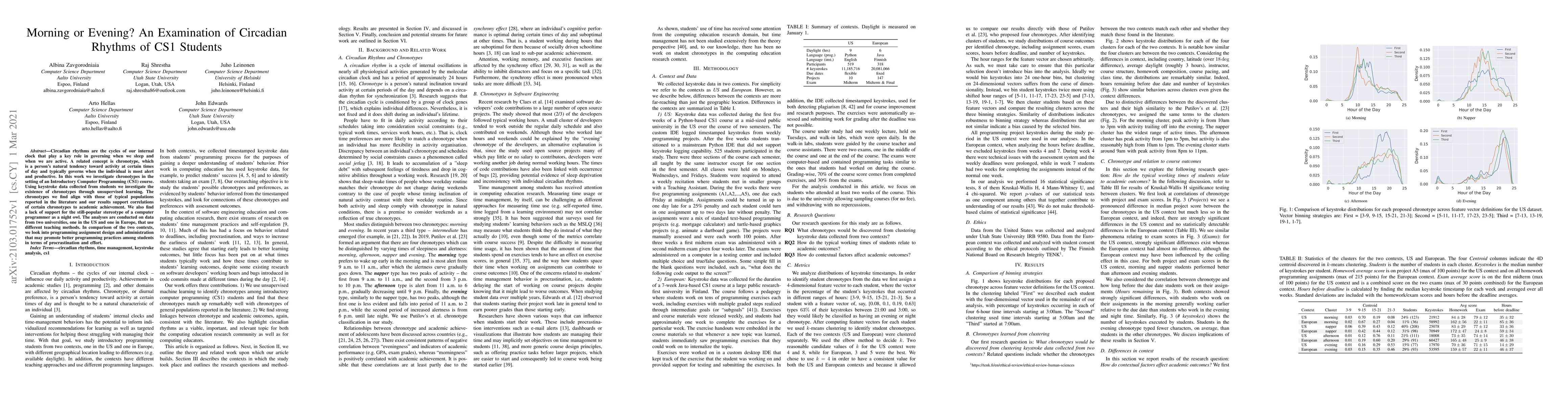 This study examines circadian rhythms of CS1 students using keystroke data, revealing chronotypes similar to general population. Results suggest certain chronotypes correlate with academic achievement, challenging the 'night owl' programmer stereotype. Analyses from US and European universities indicate potential improvements in programming assignment design to reduce procrastination and enhance effort.