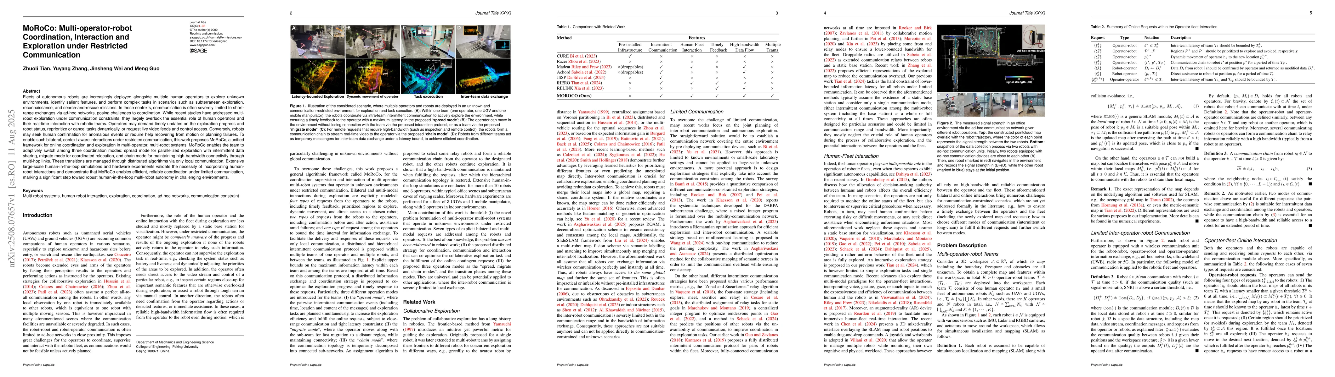 MoRoCo distinguishes itself by focusing on bilateral, context-aware interactions between human operators and robotic teams under restricted communication, which is a gap in existing multi-robot exploration studies.