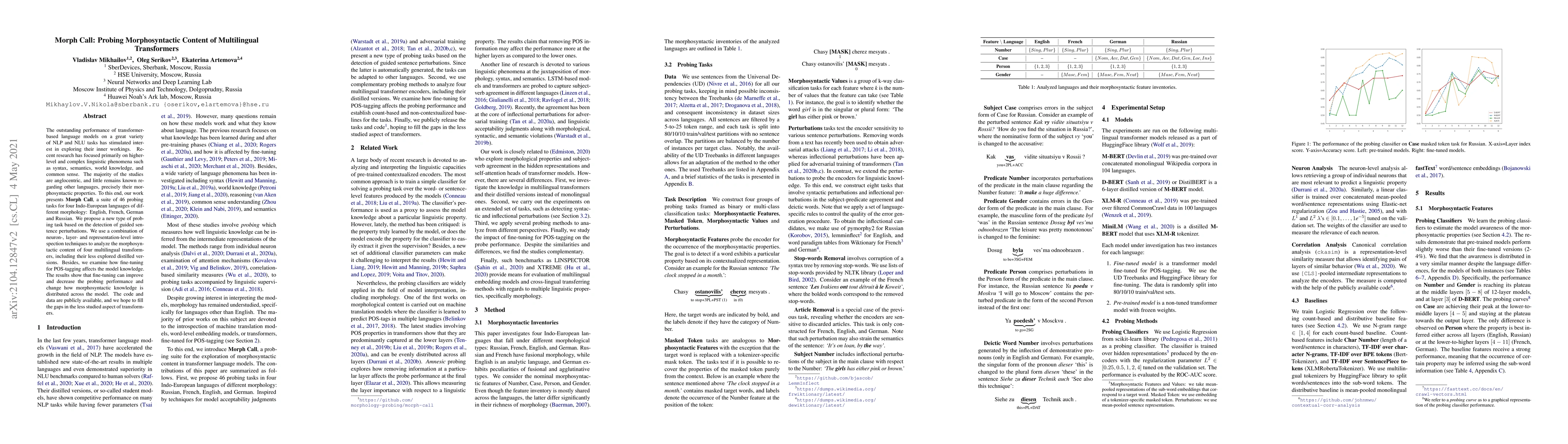This paper introduces Morph Call, a set of 46 probing tasks to analyze morphosyntactic content in multilingual transformers for four Indo-European languages. It reveals how fine-tuning affects model knowledge on POS-tagging.