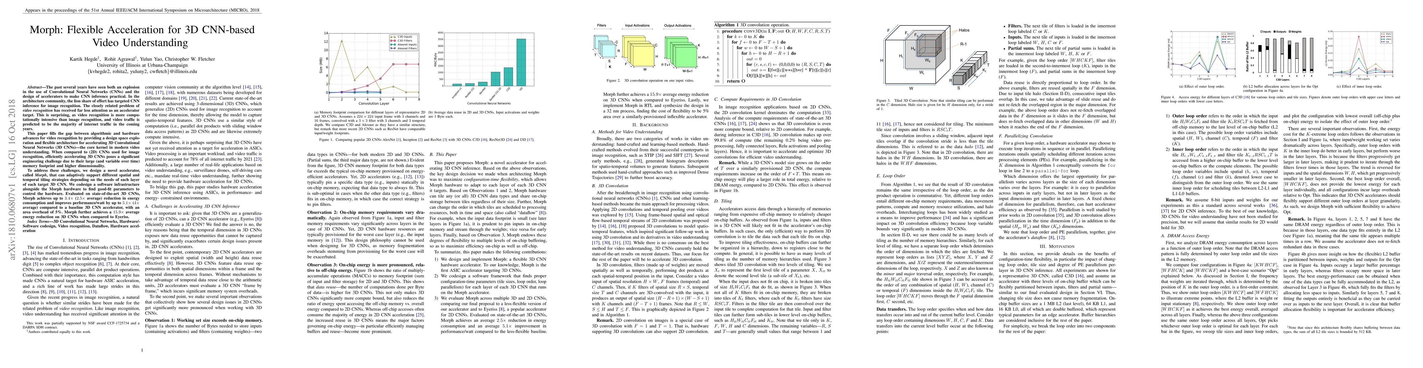 The past several years have seen both an explosion in the use of Convolutional Neural Networks (CNNs) and the design of accelerators to make CNN inference practical. In the architecture community, the lion share of effort has targeted CNN inference for image recognition. The closely related problem of video recognition has received far less attention as an accelerator target. This is surprising, as video recognition is more computationally intensive than image recognition, and video traffic is predicted to be the majority of internet traffic in the coming years. This paper fills the gap between algorithmic and hardware advances for video recognition by providing a design space exploration and flexible architecture for accelerating 3D Convolutional Neural Networks (3D CNNs) - the core kernel in modern video understanding. When compared to (2D) CNNs used for image recognition, efficiently accelerating 3D CNNs poses a significant engineering challenge due to their large (and variable over time) memory footprint and higher dimensionality. To address these challenges, we design a novel accelerator, called Morph, that can adaptively support different spatial and temporal tiling strategies depending on the needs of each layer of each target 3D CNN. We codesign a software infrastructure alongside the Morph hardware to find good-fit parameters to control the hardware. Evaluated on state-of-the-art 3D CNNs, Morph achieves up to 3.4x (2.5x average) reduction in energy consumption and improves performance/watt by up to 5.1x (4x average) compared to a baseline 3D CNN accelerator, with an area overhead of 5%. Morph further achieves a 15.9x average energy reduction on 3D CNNs when compared to Eyeriss.