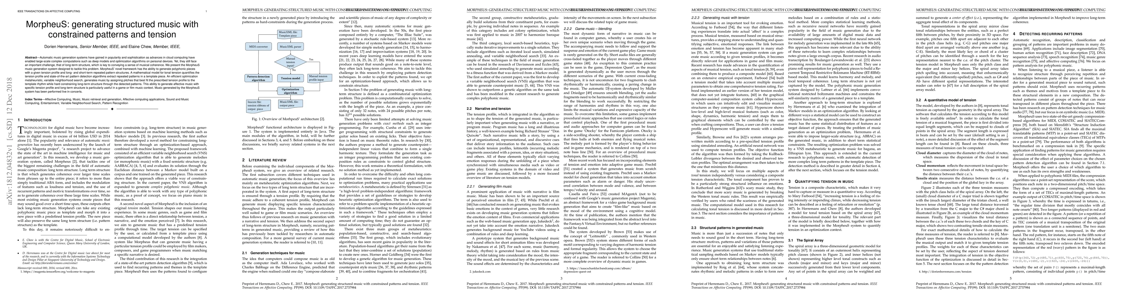The MorpheuS system generates structured polyphonic music with a specific tension profile and repeated pattern structures, addressing the challenge of long-term coherence in automatic music generation. It employs a mathematical model for tension and optimization algorithms to create music that fits prescribed tension profiles and maintains long-term structural integrity.