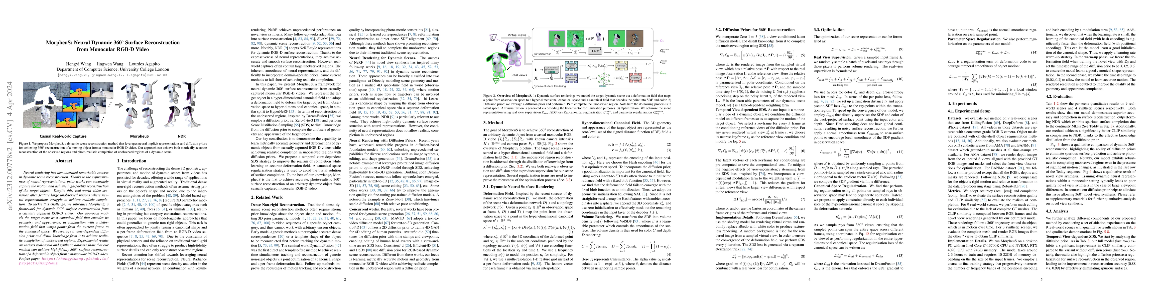 MorpheuS presents a framework for dynamic 360° surface reconstruction from monocular RGB-D video, utilizing neural rendering to model scene geometry and appearance. It employs a deformation field and view-dependent diffusion prior to achieve realistic completion of unseen regions, demonstrating high-fidelity results across datasets.
