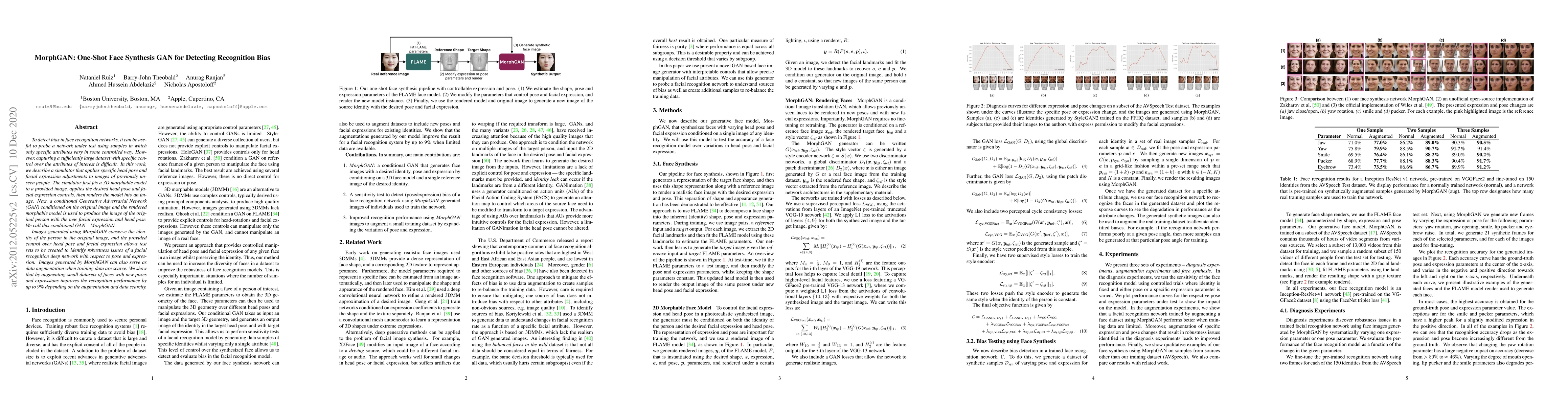 To detect bias in face recognition networks, it can be useful to probe a network under test using samples in which only specific attributes vary in some controlled way. However, capturing a sufficiently large dataset with specific control over the attributes of interest is difficult. In this work, we describe a simulator that applies specific head pose and facial expression adjustments to images of previously unseen people. The simulator first fits a 3D morphable model to a provided image, applies the desired head pose and facial expression controls, then renders the model into an image. Next, a conditional Generative Adversarial Network (GAN) conditioned on the original image and the rendered morphable model is used to produce the image of the original person with the new facial expression and head pose. We call this conditional GAN -- MorphGAN. Images generated using MorphGAN conserve the identity of the person in the original image, and the provided control over head pose and facial expression allows test sets to be created to identify robustness issues of a facial recognition deep network with respect to pose and expression. Images generated by MorphGAN can also serve as data augmentation when training data are scarce. We show that by augmenting small datasets of faces with new poses and expressions improves the recognition performance by up to 9% depending on the augmentation and data scarcity.
