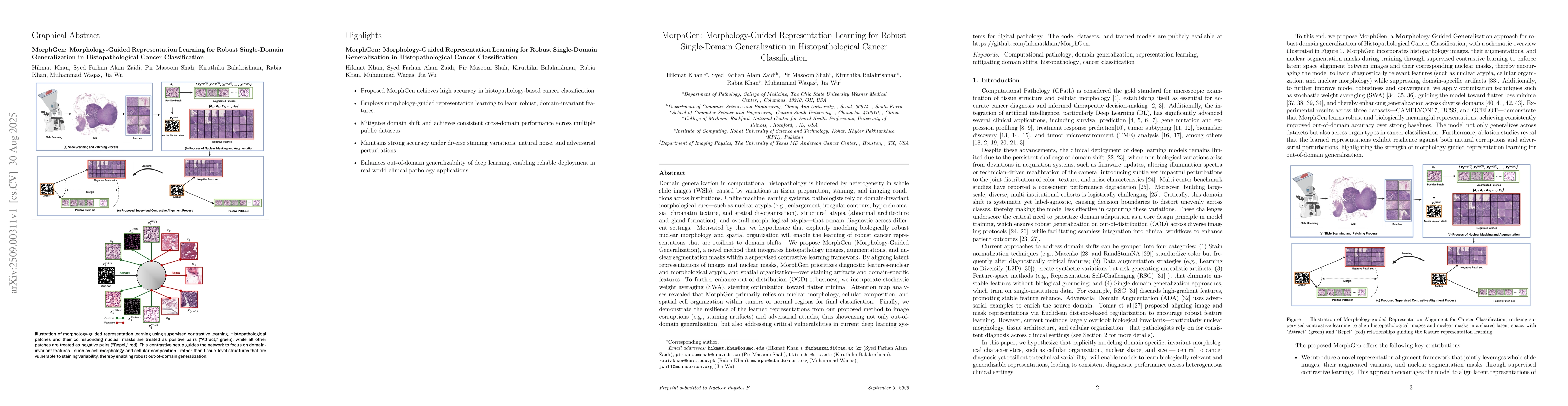 Domain generalization in computational histopathology is hindered by heterogeneity in whole slide images (WSIs), caused by variations in tissue preparation, staining, and imaging conditions across institutions. Unlike machine learning systems, pathologists rely on domain-invariant morphological cues such as nuclear atypia (enlargement, irregular contours, hyperchromasia, chromatin texture, spatial disorganization), structural atypia (abnormal architecture and gland formation), and overall morphological atypia that remain diagnostic across diverse settings. Motivated by this, we hypothesize that explicitly modeling biologically robust nuclear morphology and spatial organization will enable the learning of cancer representations that are resilient to domain shifts. We propose MorphGen (Morphology-Guided Generalization), a method that integrates histopathology images, augmentations, and nuclear segmentation masks within a supervised contrastive learning framework. By aligning latent representations of images and nuclear masks, MorphGen prioritizes diagnostic features such as nuclear and morphological atypia and spatial organization over staining artifacts and domain-specific features. To further enhance out-of-distribution robustness, we incorporate stochastic weight averaging (SWA), steering optimization toward flatter minima. Attention map analyses revealed that MorphGen primarily relies on nuclear morphology, cellular composition, and spatial cell organization within tumors or normal regions for final classification. Finally, we demonstrate resilience of the learned representations to image corruptions (such as staining artifacts) and adversarial attacks, showcasing not only OOD generalization but also addressing critical vulnerabilities in current deep learning systems for digital pathology. Code, datasets, and trained models are available at: https://github.com/hikmatkhan/MorphGen