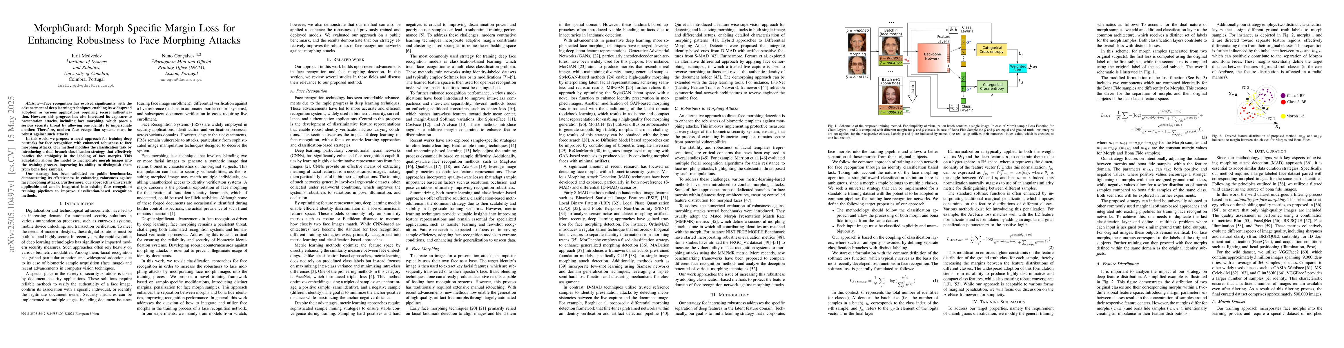 The introduction of a morph-specific margin loss function and a dual-branch classification strategy for training deep networks in face recognition to improve robustness against morphing attacks.