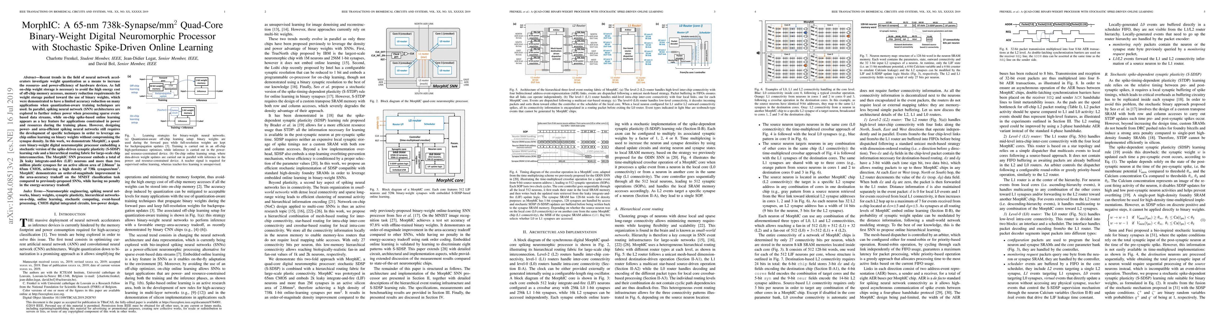 MorphIC is a 65-nm quad-core neuromorphic processor featuring 738k binary-weight synapses/mm², utilizing a stochastic spike-driven learning rule for efficient online training. It achieves significant improvements in area-accuracy for MNIST classification without compromising energy-accuracy.