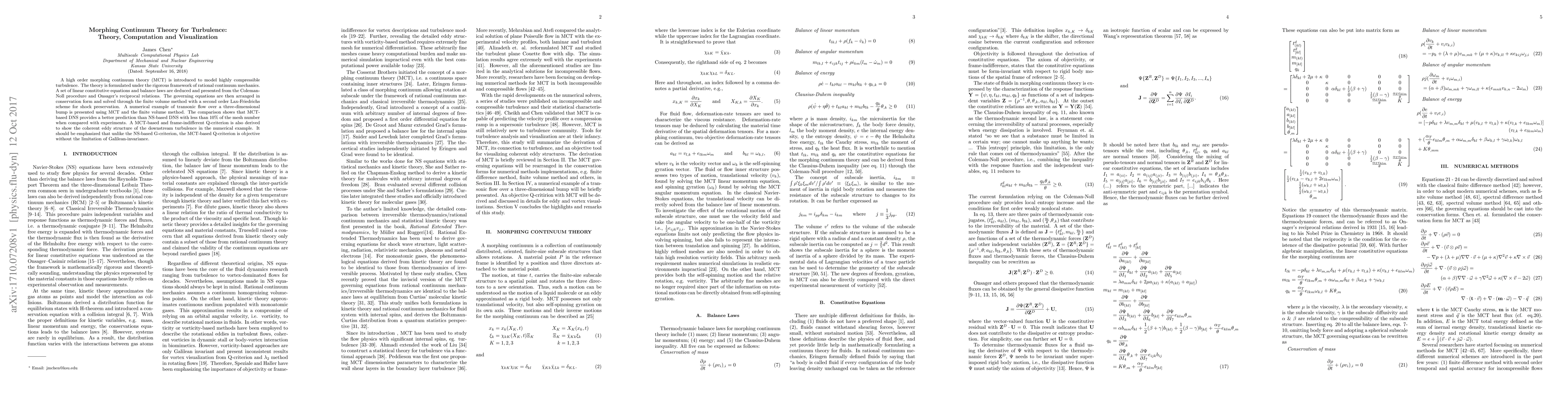 A high order morphing continuum theory (MCT) is introduced to model highly compressible turbulence. The theory is formulated under the rigorous framework of rational continuum mechanics. A set of linear constitutive equations and balance laws are deduced and presented from the Coleman-Noll procedure and Onsager's reciprocal relations. The governing equations are then arranged in conservation form and solved through the finite volume method with a second order Lax-Friedrichs scheme for shock preservation. A numerical example of transonic flow over a three-dimensional bump is presented using MCT and the finite volume method. The comparison shows that MCT-based DNS provides a better prediction than NS-based DNS with less than 10% of the mesh number when compared with experiments. A MCT-based and frame-indifferent Q-criterion is also derived to show the coherent eddy structure of the downstream turbulence in the numerical example. It should be emphasized that unlike the NS-based G-criterion, the MCT-based Q-criterion is objective without the limitation of Galilean-invariance.