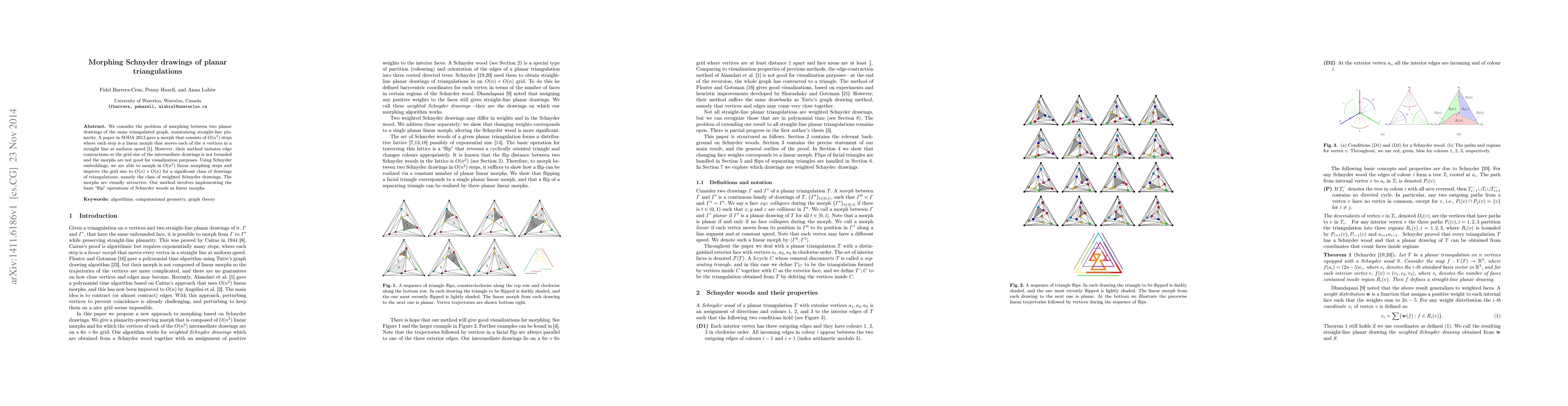 We consider the problem of morphing between two planar drawings of the same triangulated graph, maintaining straight-line planarity. A paper in SODA 2013 gave a morph that consists of $O(n^2)$ steps where each step is a linear morph that moves each of the $n$ vertices in a straight line at uniform speed. However, their method imitates edge contractions so the grid size of the intermediate drawings is not bounded and the morphs are not good for visualization purposes. Using Schnyder embeddings, we are able to morph in $O(n^2)$ linear morphing steps and improve the grid size to $O(n)\times O(n)$ for a significant class of drawings of triangulations, namely the class of weighted Schnyder drawings. The morphs are visually attractive. Our method involves implementing the basic "flip" operations of Schnyder woods as linear morphs.