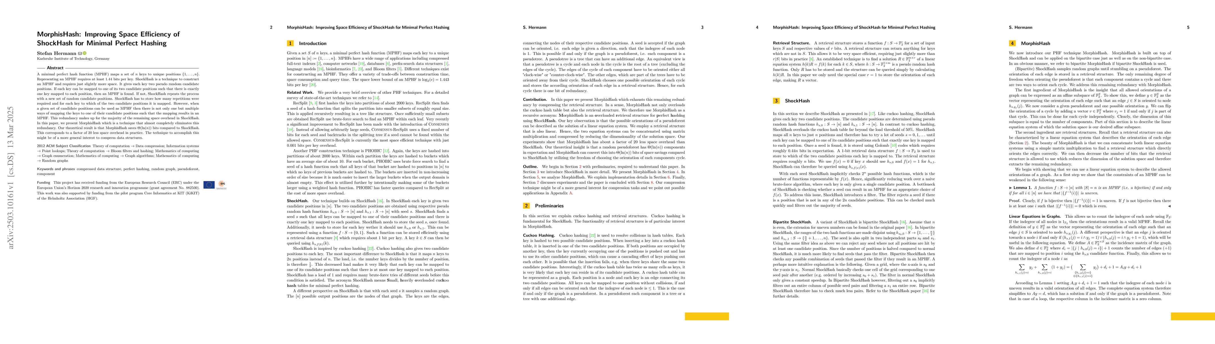 The paper presents MorphisHash, a technique that improves the space efficiency of ShockHash for minimal perfect hashing by almost completely eliminating redundancy in candidate position mappings. It uses a pseudoforest model and analyzes the distribution of hashed graphs conditioned on the event that the graph is a pseudoforest.