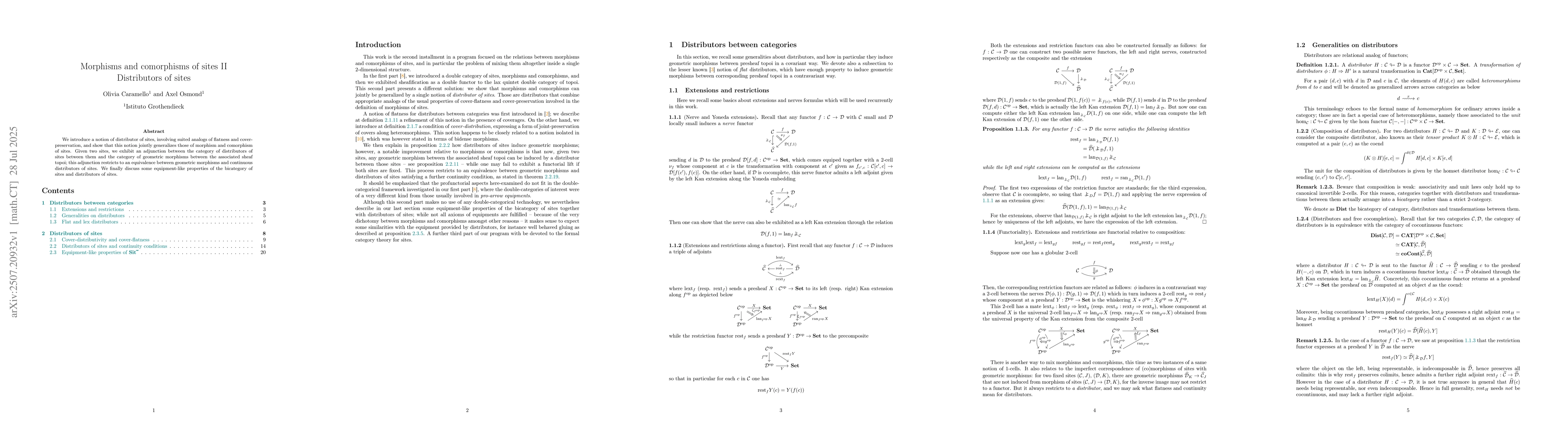We introduce a notion of distributor of sites, involving suited analogs of flatness and cover-preservation, and show that this notion jointly generalizes those of morphism and comorphism of sites. Given two sites, we exhibit an adjunction between the category of distributors of sites between them and the category of geometric morphisms between the associated sheaf topoi; this adjunction restricts to an equivalence between geometric morphisms and continuous distributors of sites. We finally discuss some equipment-like properties of the bicategory of sites and distributors of sites.