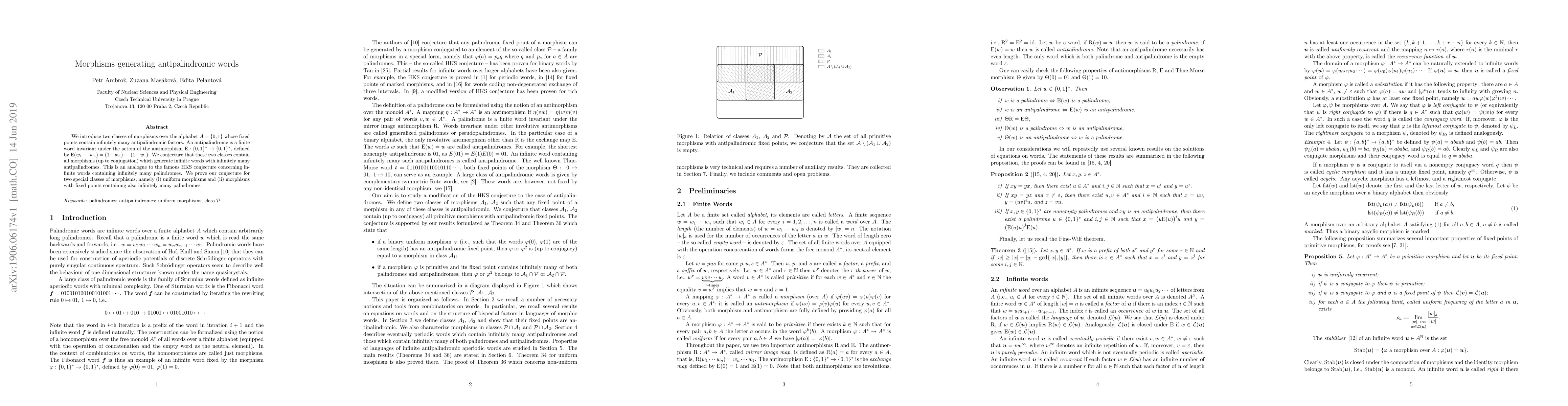 The paper defines and analyzes two new classes of morphisms (A1 and A2) and proves key properties related to their generation of infinite words with infinitely many antipalindromic factors.