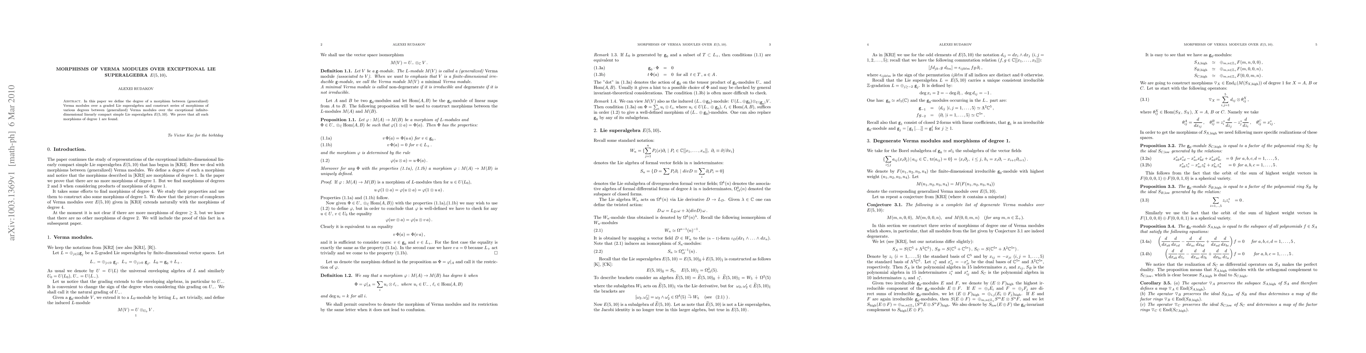 This paper defines the degree of morphisms between (generalized) Verma modules over a graded Lie superalgebra and constructs series of morphisms of various degrees for the exceptional Lie superalgebra E(5,10). It proves that all morphisms of degree 1 between these modules are identified.