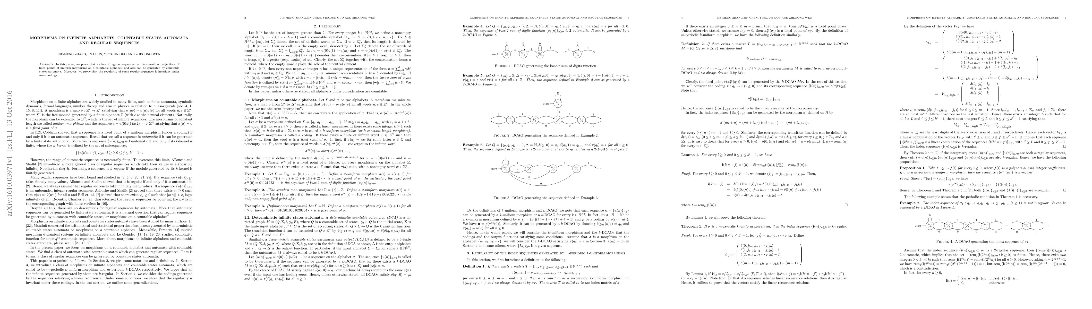 Researchers prove a class of regular sequences can be generated by countable states automata and viewed as projections of uniform morphisms on a countable alphabet.