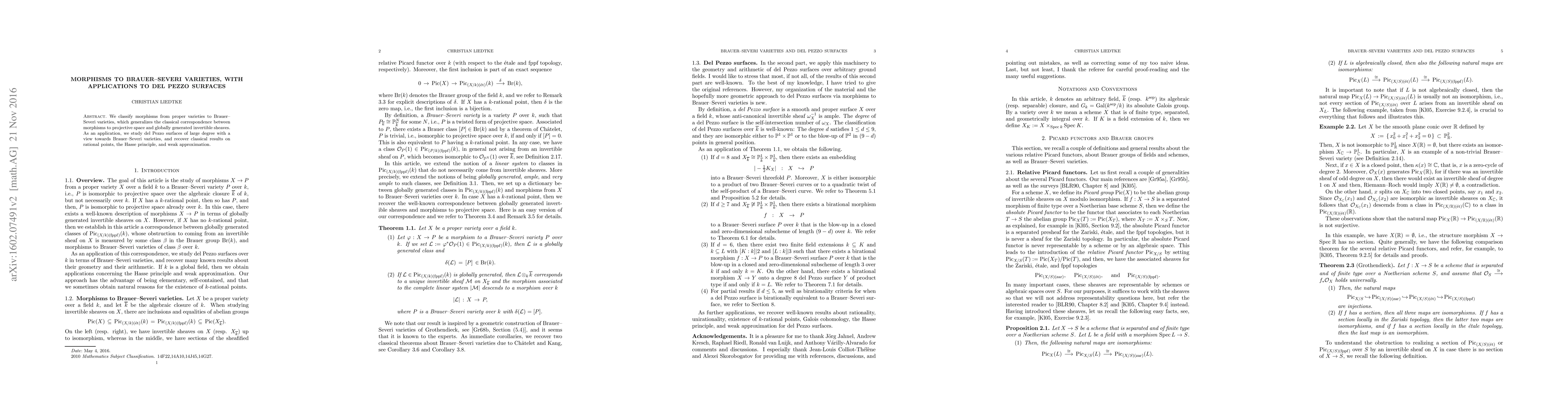 This paper classifies morphisms from proper varieties to Brauer-Severi varieties, extending the classical link between projective space morphisms and globally generated sheaves. It applies this classification to del Pezzo surfaces, yielding insights into rational points, the Hasse principle, and weak approximation.