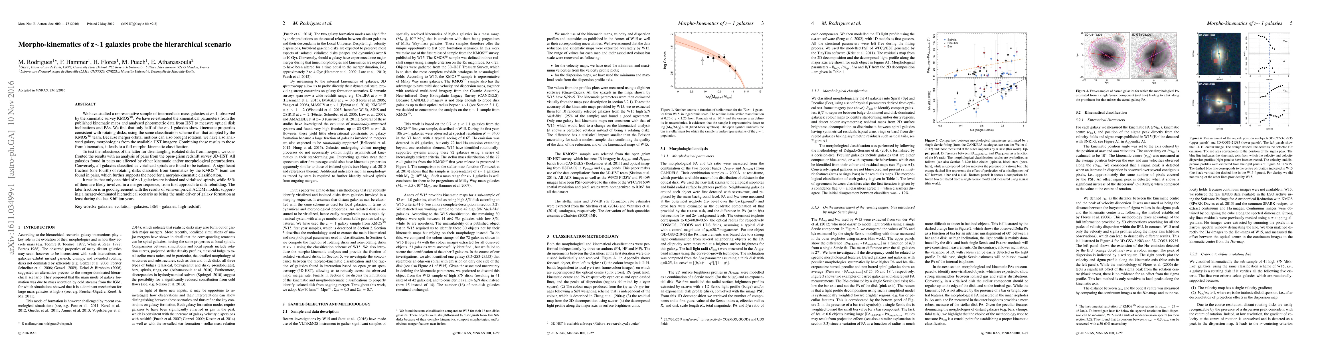 This study examines the morpho-kinematics of z~1 galaxies using KMOS3D and HST data, revealing that only half exhibit properties consistent with rotating disks. A morpho-kinematic classification shows that most galaxies are involved in merger sequences, supporting a merger-dominated hierarchical galaxy formation model.