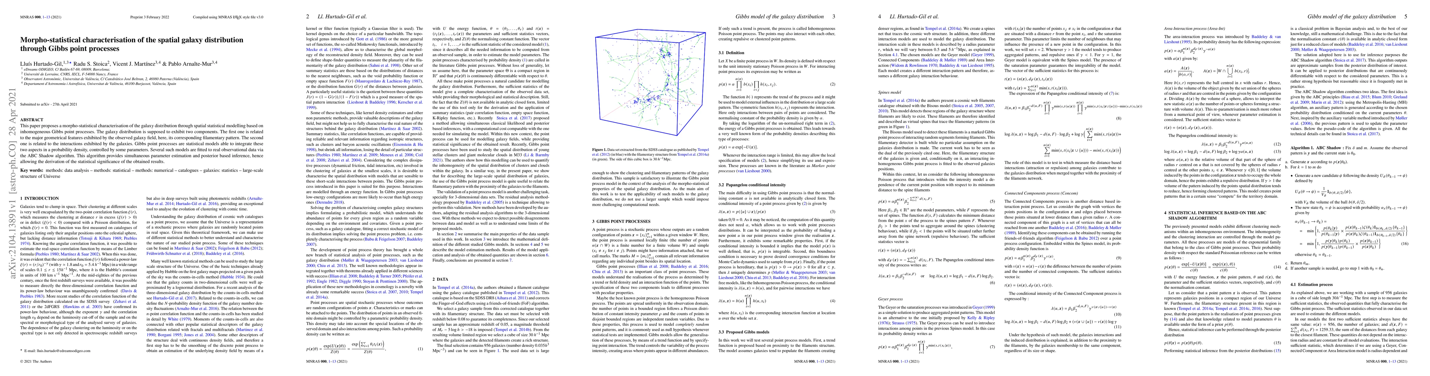 This paper proposes a morpho-statistical characterisation of the galaxy distribution through spatial statistical modelling based on inhomogeneous Gibbs point processes. The galaxy distribution is supposed to exhibit two components. The first one is related to the major geometrical features exhibited by the observed galaxy field, here, its corresponding filamentary pattern. The second one is related to the interactions exhibited by the galaxies. Gibbs point processes are statistical models able to integrate these two aspects in a probability density, controlled by some parameters. Several such models are fitted to real observational data via the ABC Shadow algorithm. This algorithm provides simultaneous parameter estimation and posterior based inference, hence allowing the derivation of the statistical significance of the obtained results.