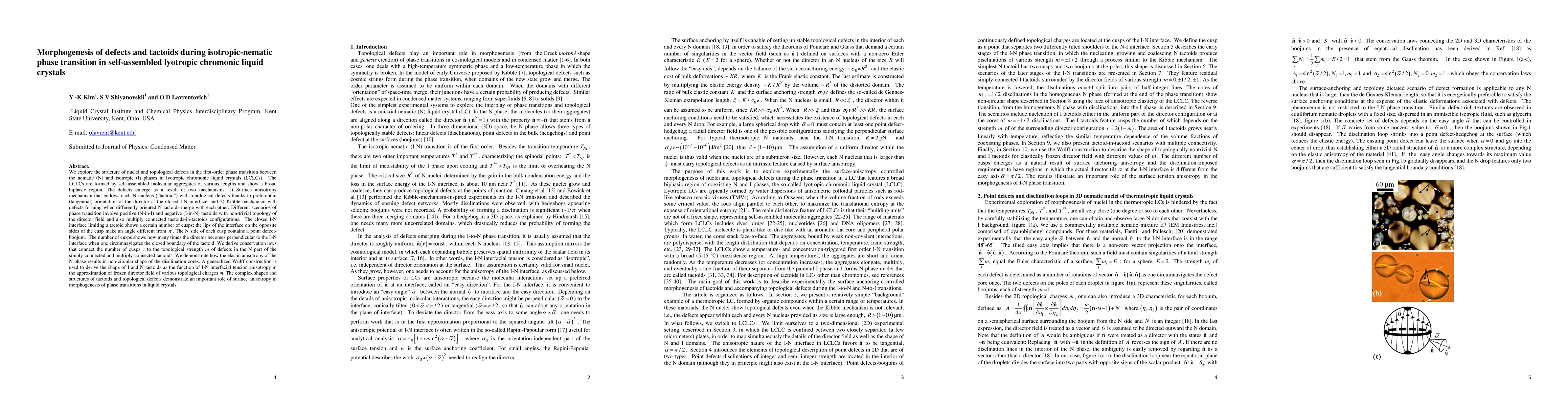 This paper investigates the formation of nuclei and topological defects during the phase transition between nematic and isotropic phases in lyotropic chromonic liquid crystals, revealing the role of surface anisotropy and Kibble mechanism in defect emergence. It derives conservation laws linking defect topology to the number of cusps and demonstrates the influence of elastic anisotropy on the shape of tactoids.