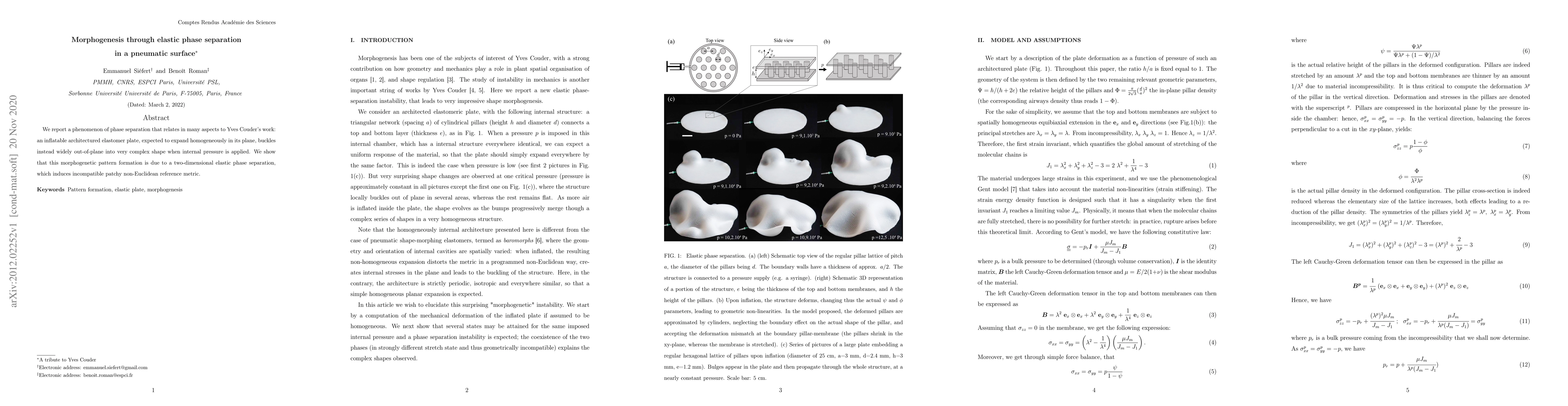 We report a phenomenon of phase separation that relates in many aspects to Yves Couder's work: an inflatable architectured elastomer plate, expected to expand homogeneously in its plane, buckles instead widely out-of-plane into very complex shape when internal pressure is applied. We show that this morphogenetic pattern formation is due to a two-dimensional elastic phase separation, which induces incompatible patchy non-Euclidean reference metric.