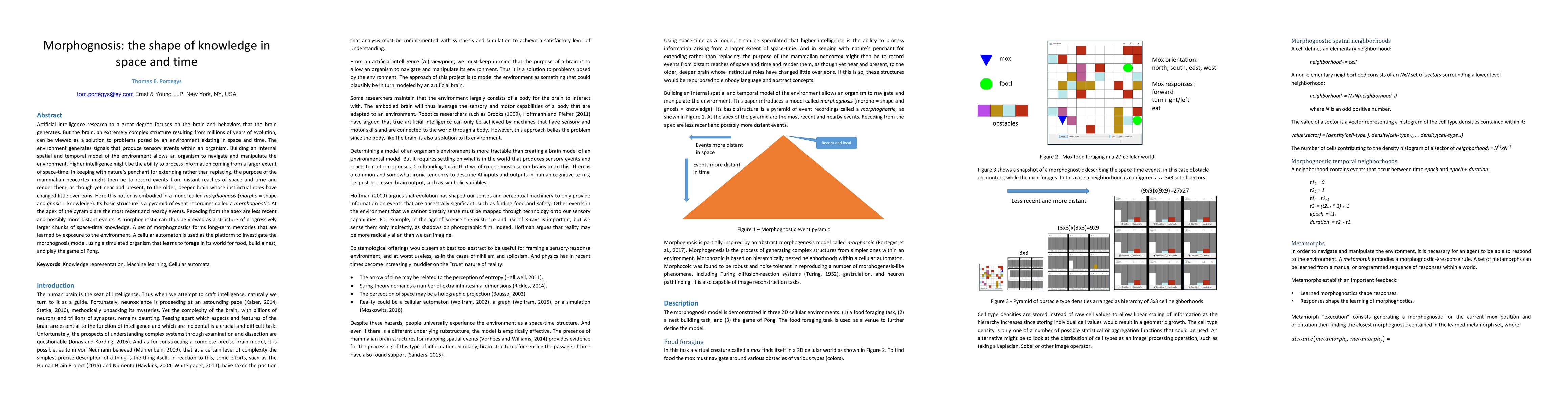 Artificial intelligence research to a great degree focuses on the brain and behaviors that the brain generates. But the brain, an extremely complex structure resulting from millions of years of evolution, can be viewed as a solution to problems posed by an environment existing in space and time. The environment generates signals that produce sensory events within an organism. Building an internal spatial and temporal model of the environment allows an organism to navigate and manipulate the environment. Higher intelligence might be the ability to process information coming from a larger extent of space-time. In keeping with nature's penchant for extending rather than replacing, the purpose of the mammalian neocortex might then be to record events from distant reaches of space and time and render them, as though yet near and present, to the older, deeper brain whose instinctual roles have changed little over eons. Here this notion is embodied in a model called morphognosis (morpho = shape and gnosis = knowledge). Its basic structure is a pyramid of event recordings called a morphognostic. At the apex of the pyramid are the most recent and nearby events. Receding from the apex are less recent and possibly more distant events. A morphognostic can thus be viewed as a structure of progressively larger chunks of space-time knowledge. A set of morphognostics forms long-term memories that are learned by exposure to the environment. A cellular automaton is used as the platform to investigate the morphognosis model, using a simulated organism that learns to forage in its world for food, build a nest, and play the game of Pong.