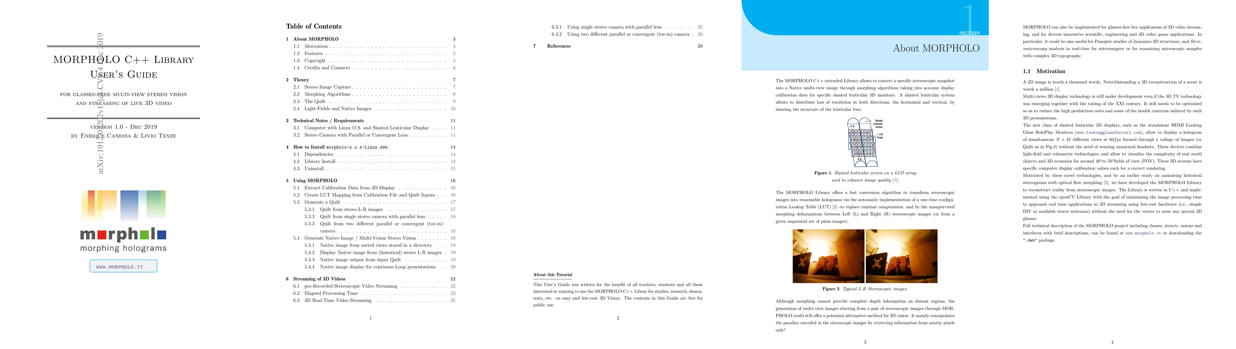 The MORPHOLO C++ Library facilitates the conversion of stereoscopic images into multi-view formats for glasses-free 3D displays, enabling live 3D video streaming and applications in scientific, engineering, and gaming fields. It utilizes morphing algorithms and display calibration data for optimal performance on slanted lenticular 3D monitors.