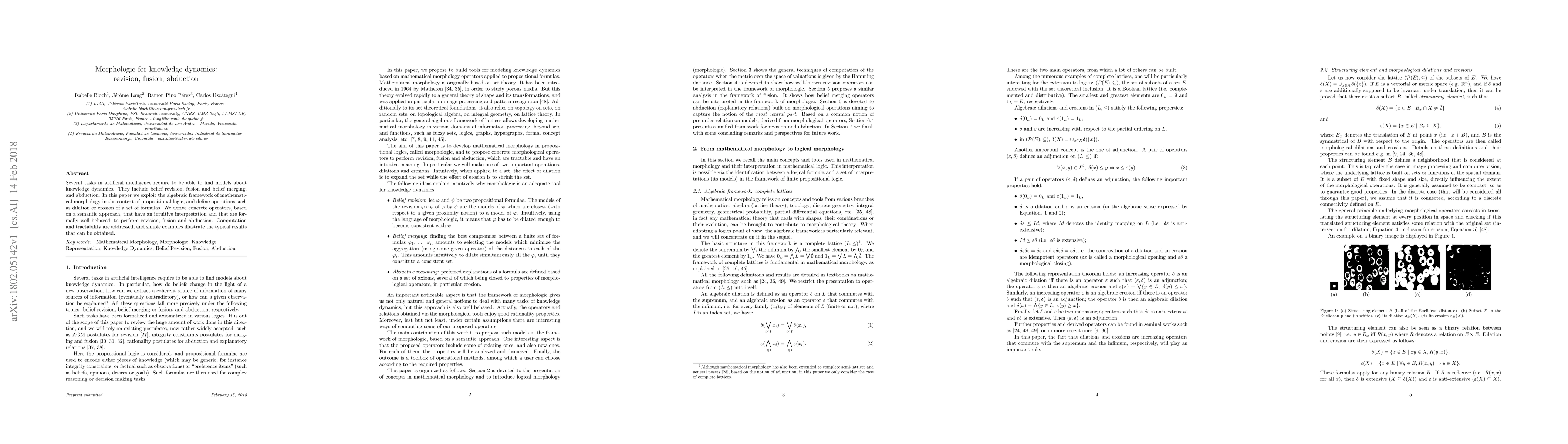 Several tasks in artificial intelligence require to be able to find models about knowledge dynamics. They include belief revision, fusion and belief merging, and abduction. In this paper we exploit the algebraic framework of mathematical morphology in the context of propositional logic, and define operations such as dilation or erosion of a set of formulas. We derive concrete operators, based on a semantic approach, that have an intuitive interpretation and that are formally well behaved, to perform revision, fusion and abduction. Computation and tractability are addressed, and simple examples illustrate the typical results that can be obtained.