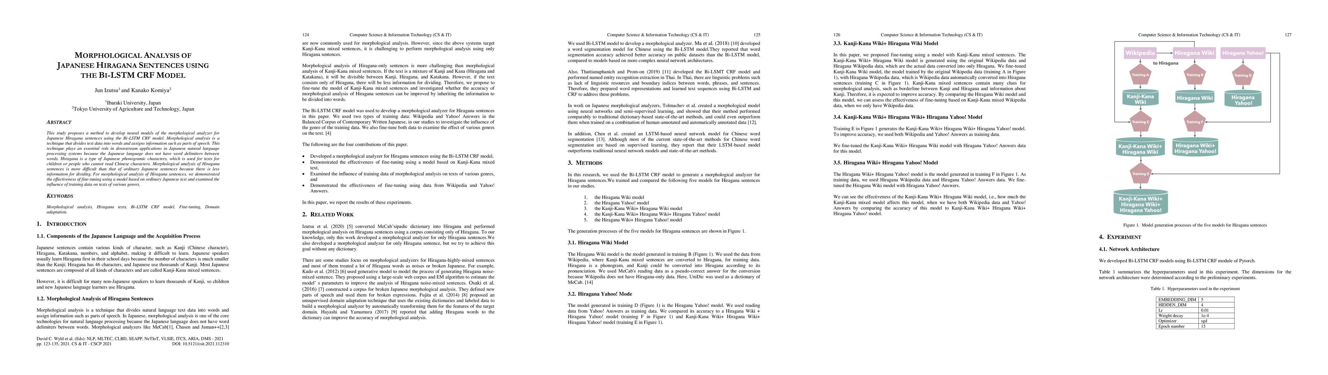 This study develops a neural model for morphological analysis of Hiragana sentences using a Bi-LSTM CRF model, demonstrating its effectiveness in dividing text without word delimiters and examining the impact of training data from various genres.